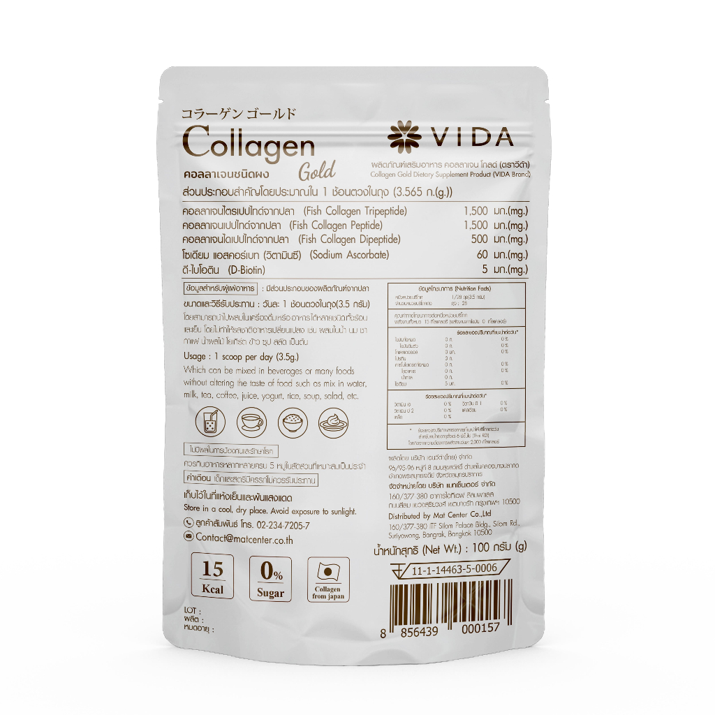 Vida Collagen gold 100 g. 1 sachets(วีด้า คอลลาเจน โกลด์ 100 กรัม 1 ซอง)