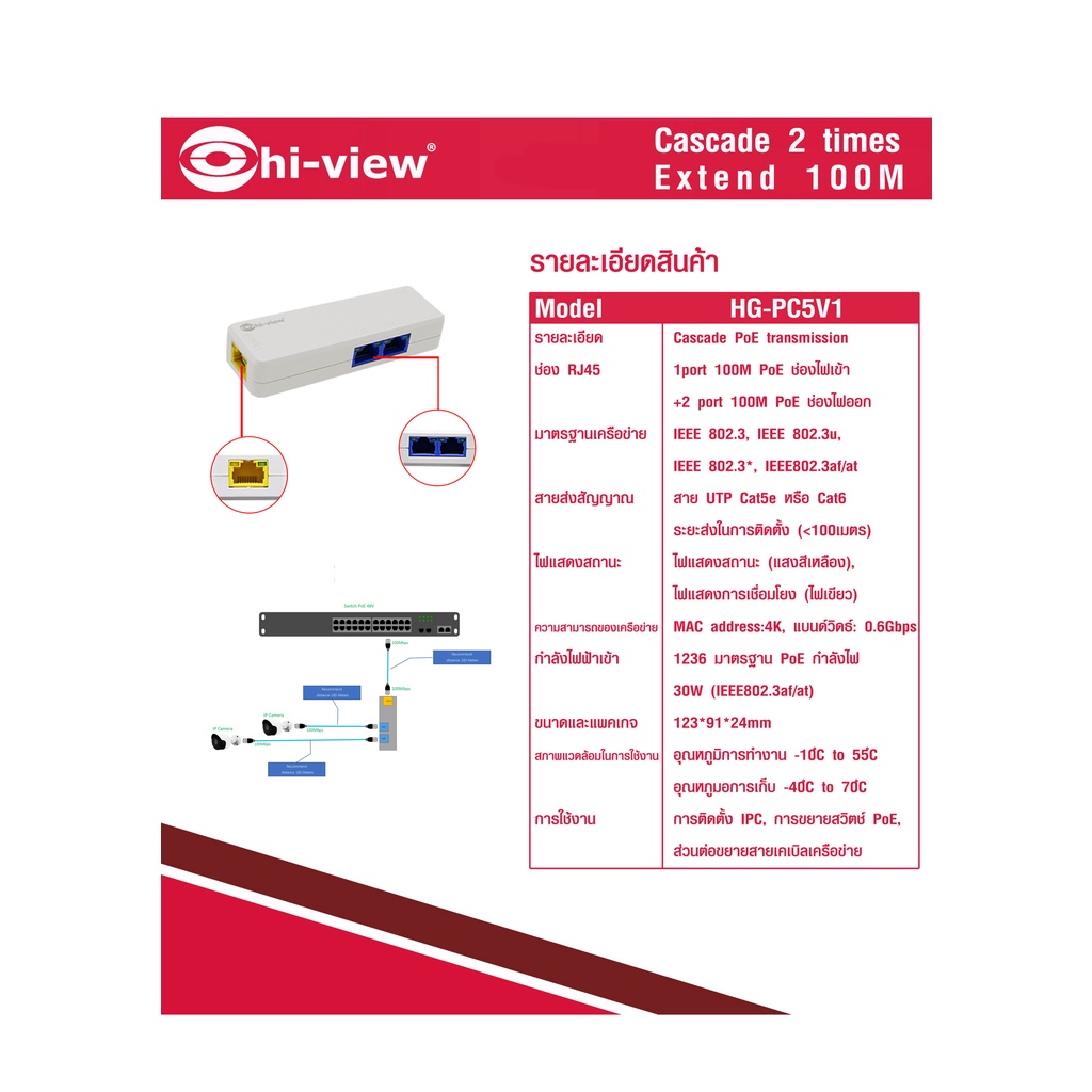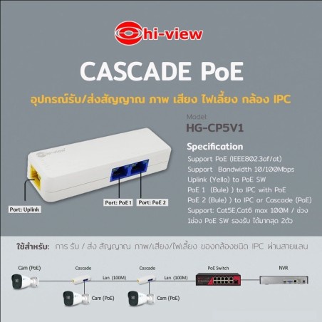 Hi-view CASCADE POE Transmission อุปกรณ์รับ/ส่ง สัญญาณภาพ เสียง ไฟเลี้ยง สำหรับกล้อง IPC รุ่น HG-PC5-V1