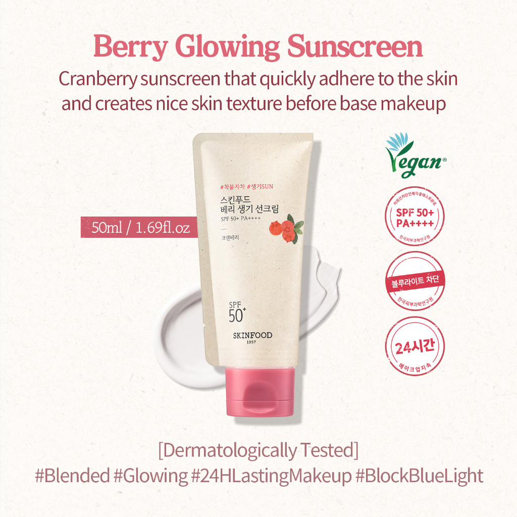 [SKINFOOD Official] ครีมกันแดดเบอร์รีสูตรผิวโกลว์ 50ml SPF 50+ PA++++ กันแดดที่ผสม Moisturizer เพิ่มความโกลว์ให้ผิว ลดริ้วรอย ป้องกัน UV & Blue Light ติดทนบน makeup ยาวนานถึง 24ชม. Berry Glowing Hybrid Sunscreen