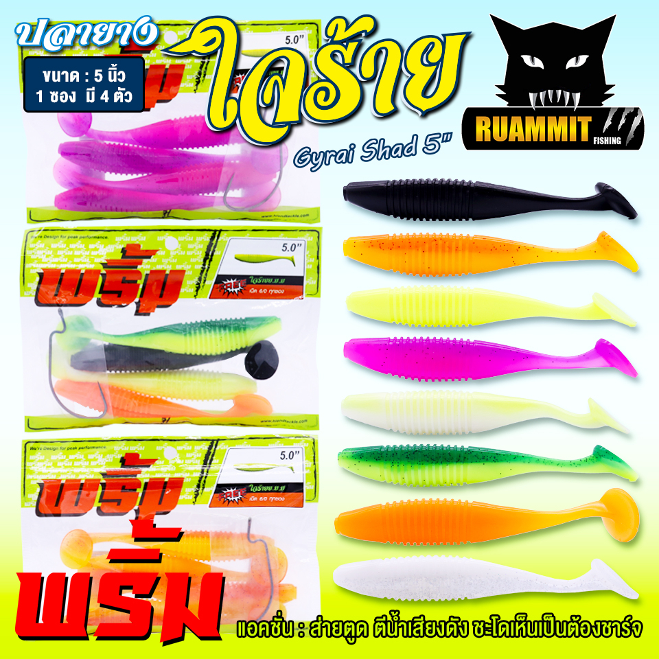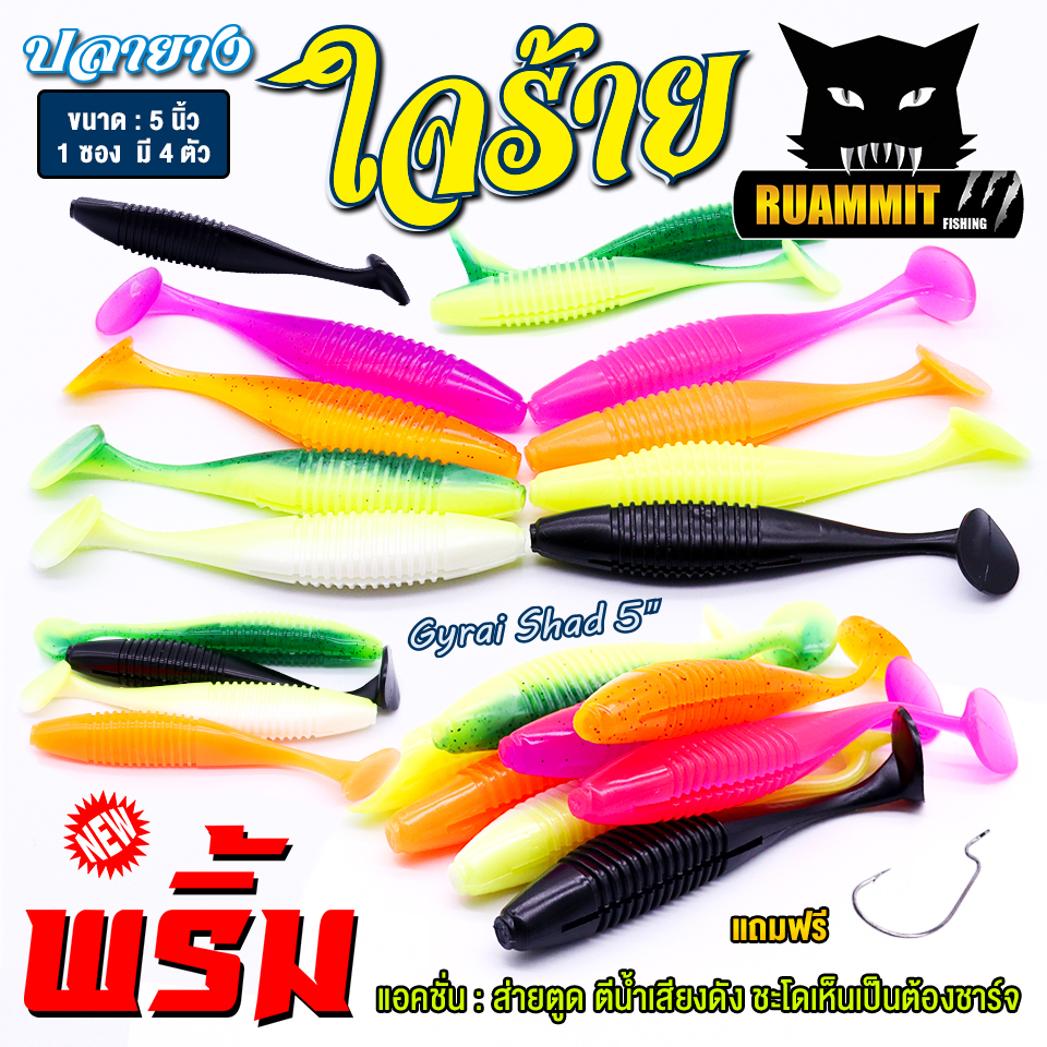 เหยื่อตกปลา เหยื่อยาง พริ้ม ใจร้าย Gyrai Shad 5 นิ้ว by พริ้ม ลัวร์ (1 ซองมี 4 ตัว เบ็ดฟรี 1 ดวง)