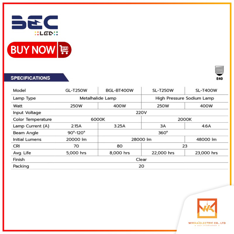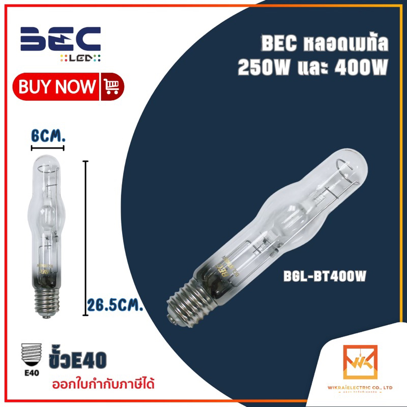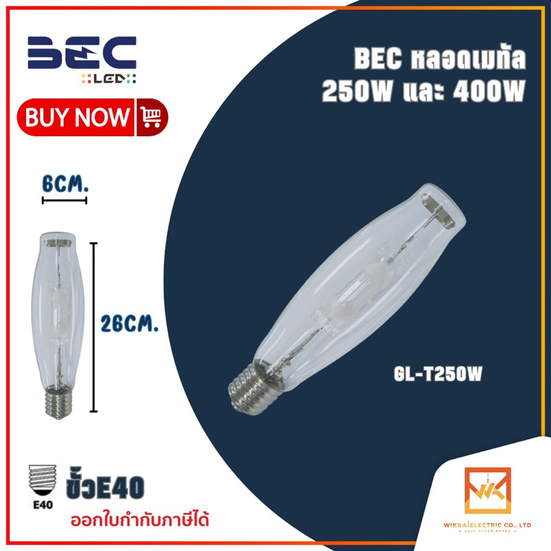 BEC หลอดเมทัล ทรงกระบอก 250W 400W ขั้ว E40 ผ่านบัลลาส รุ่น GL-T250W และ BGL-BT400W ขั้ว E40 แสงขาว