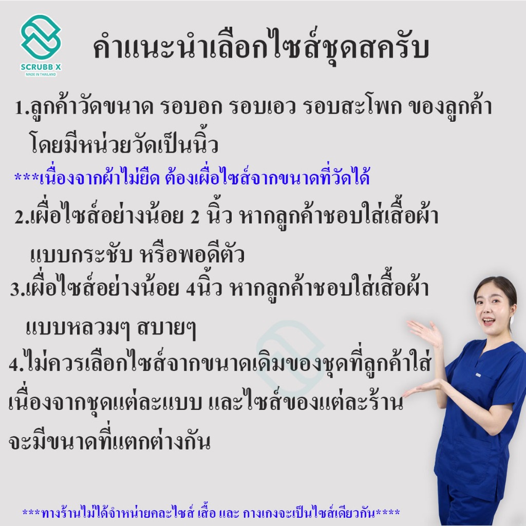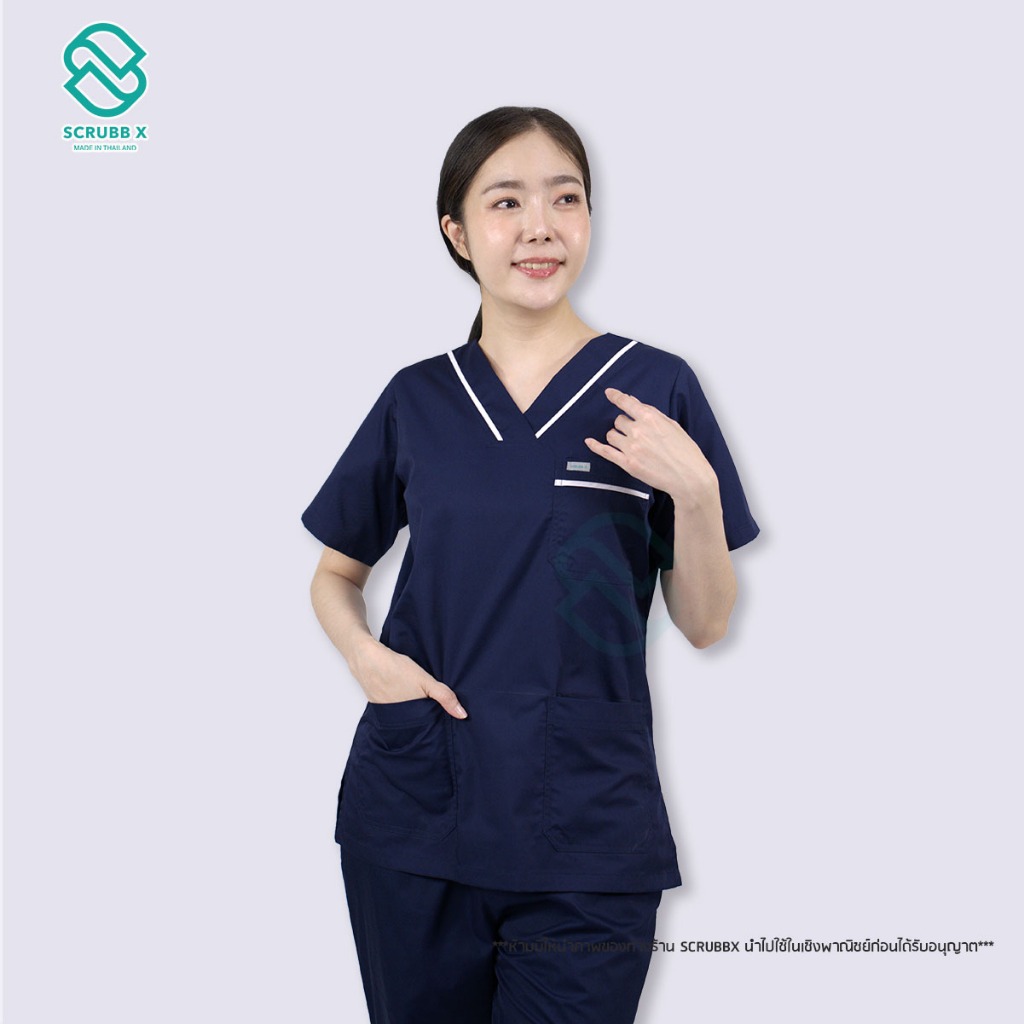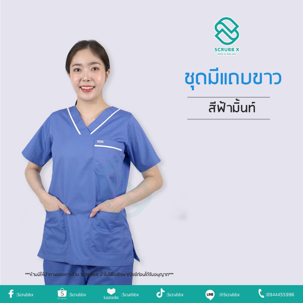 ชุดสครับแบบมีแถบขาว คอวี สีฟ้ามิ้นท์ สีกรม ชุดสครับเครือรพ.กรุงเทพ ผ้าคอมทวิวใส่สบาย ใส่ได้ทั้งหญิงและชาย