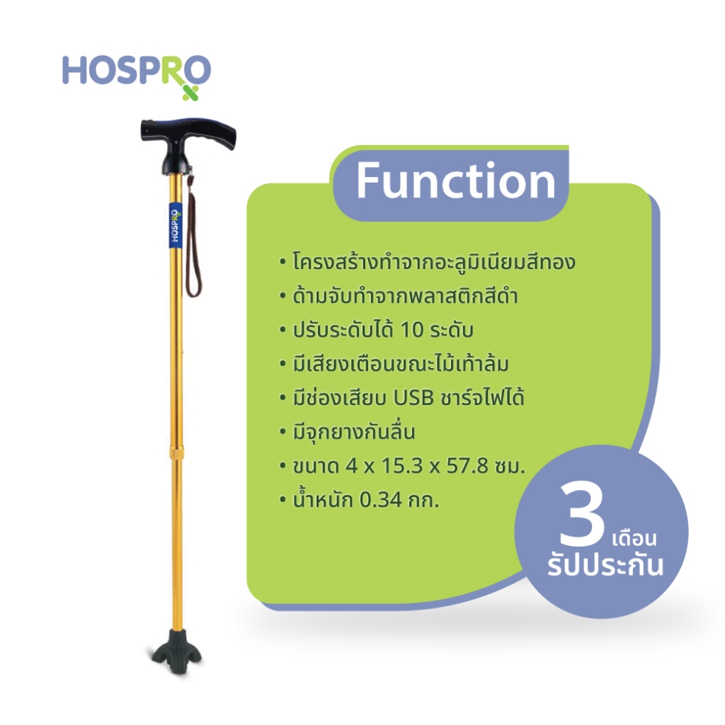 HOSPRO ไม้เท้าไฟฉาย เตือนเมื่อไม้เท้าล้ม เสียงดังสนั่นหวั่นไหว Walking stick ไม้เท้าขาเดี่ยว รุ่น H-WS9301L-1CH