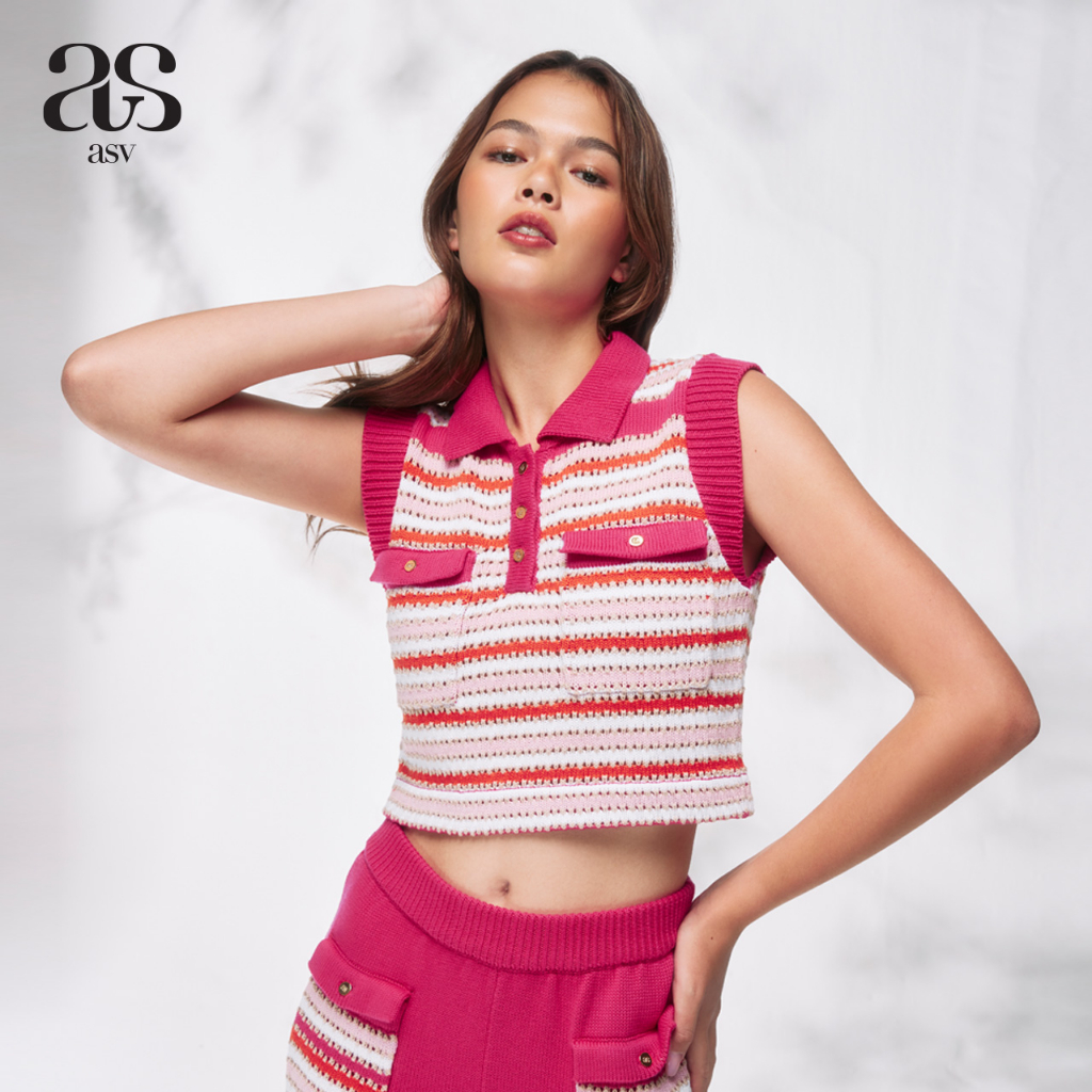 [asv pf23] Leyla Stripe Knitted Polo เสื้อผู้หญิง ทรงครอป คอปกโปโล แขนกุด ตกแต่งกระเป๋าหน้า ผ้านิตทอลายทาง