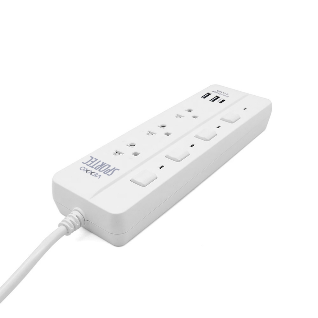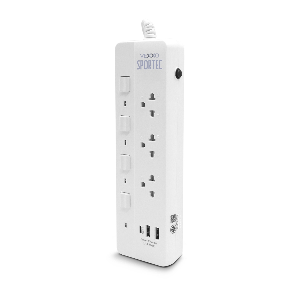 ปลั๊กไฟ Vexxo Sportec รุ่น P431 (10A 2300W) 4 สวิตช์ 3 ช่องเสียบ 2 ยูเอสบี 1ไทป์ ความยาวสาย 3 เมตร