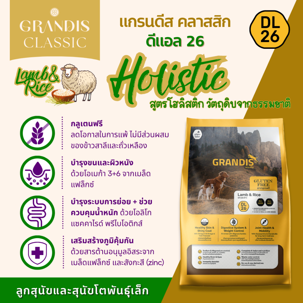 แกรนดีส DL26 (1.5กก) อาหารสุนัข สูตรกลูเตนฟรี แกะและข้าว GRANDIS DL26 Lamb & Rice Dog Food