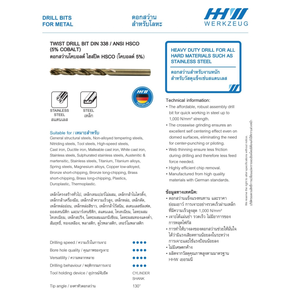 HHW ดอกสว่านโคบอลต์ HSS-CO เจาะเหล็ก ขนาด 8.0 mm.-13.0 mm. รุ่น DIN 338