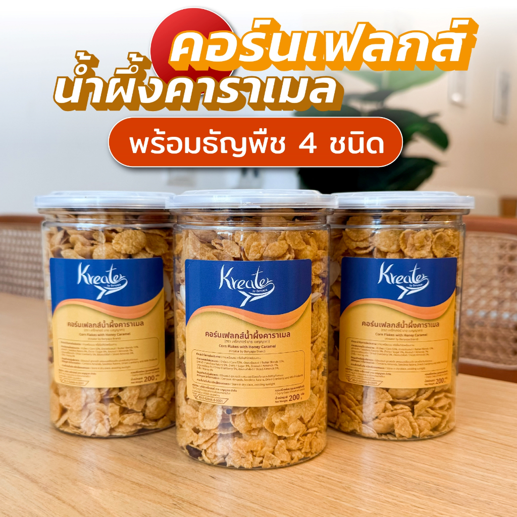 คอร์นเฟลกส์เคลือบน้ำผึ้งคาราเมล พร้อมธัญพืช 4 ชนิด (อัลมอนด์เม็ด อัลมอนด์สไลด์ ลูกเกด แครนเบอร์รี)