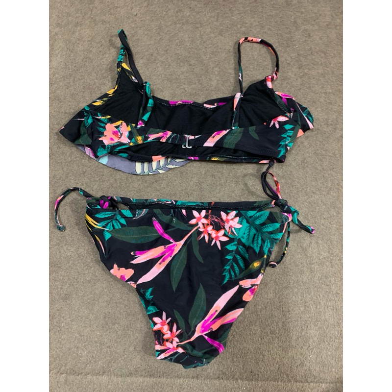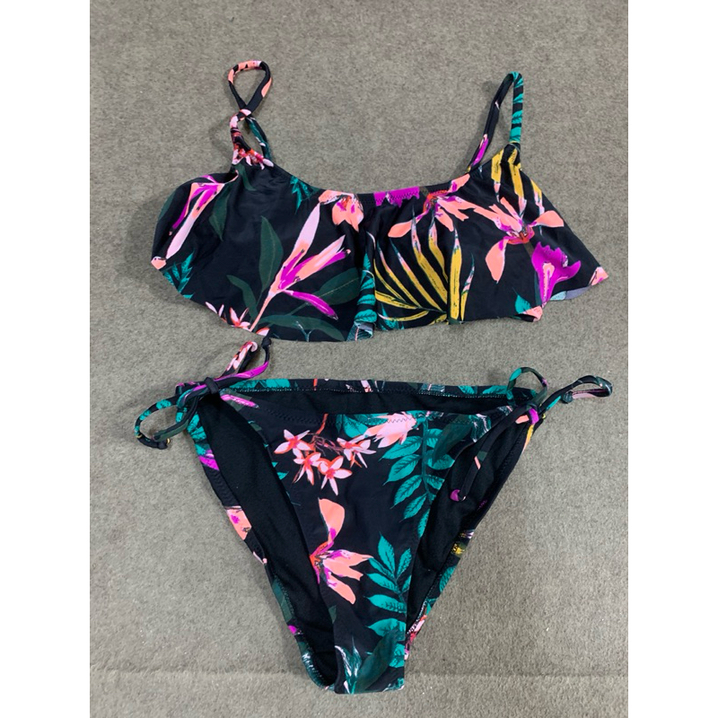 บิกินี่ทูพีชเสื้อสายเดี่ยวสีดำลายดอก กางเกงเป็นแบบผูกข้างเอวต่ำ ด้านหลังรอบอกปรับได้สามระดับ