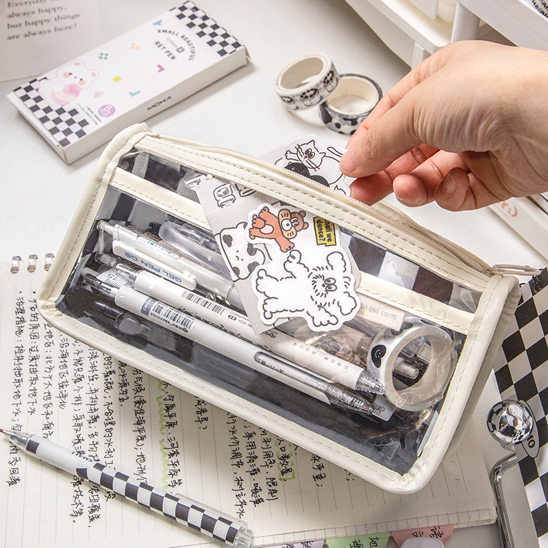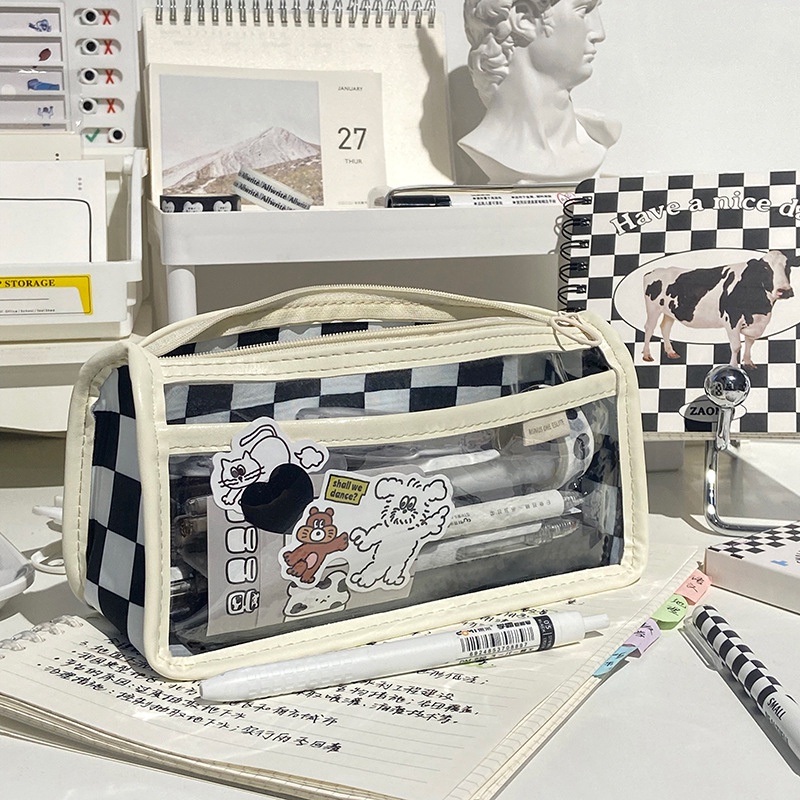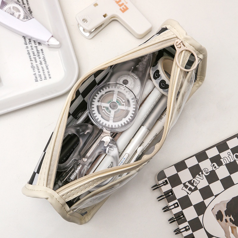 กระเป๋าดินสอ ลายหมากรุก ขนาดใหญ่ จุของได้เยอะ สีโปร่งใส