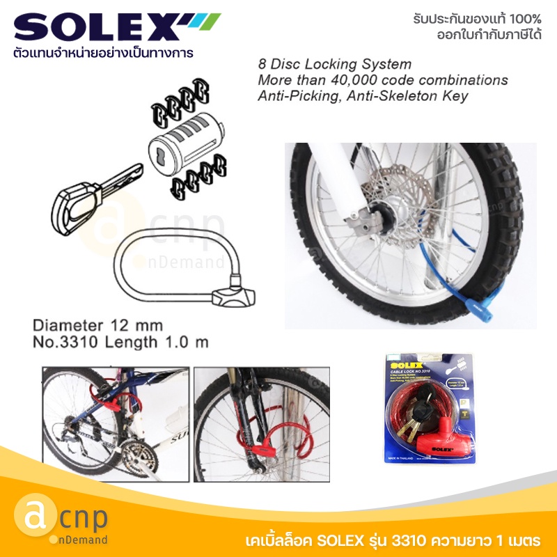 SOLEX เคเบิ้ลล็อค สายล็อคจักรยาน กุญแจล็อคจักรยาน โซเล็กซ์ Cable Lock ใช้กุญแจ 3310 และหมุนรหัส C412
