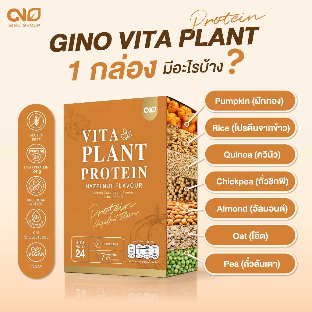 Gino Vita Plant Based Protein จิโน โปรตีนพืช ผสมแคลเซียม เสริมกล้ามเนื้อ บำรุงกระดูก กลิ่นฮาเซลนัท