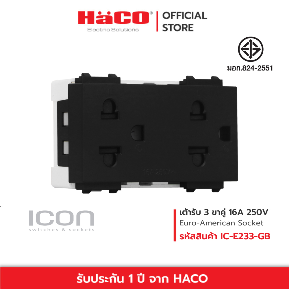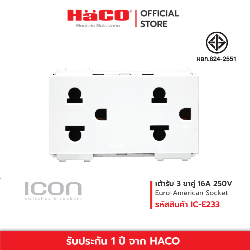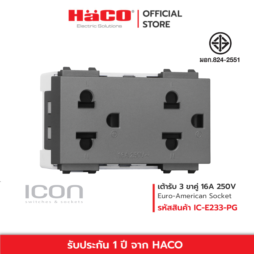 HACO เต้ารับ 3 ขาคู่ Duplex 3 pin Ero-American Socket 16A 250V รุ่น สีขาว IC-E233 , สีเทา IC-E233-PG , สีดำ IC-E233-GB
