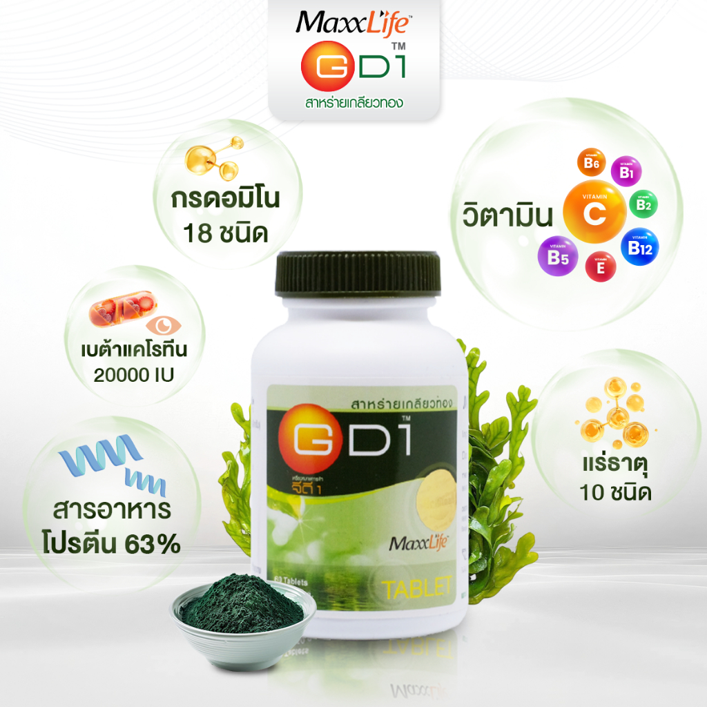 Maxxlife GD1 สาหร่ายเกลียวทอง Spirulina 100% บุญสมฟาร์ม บำรุงร่างกาย โปรตีนสูง (60 เม็ด)