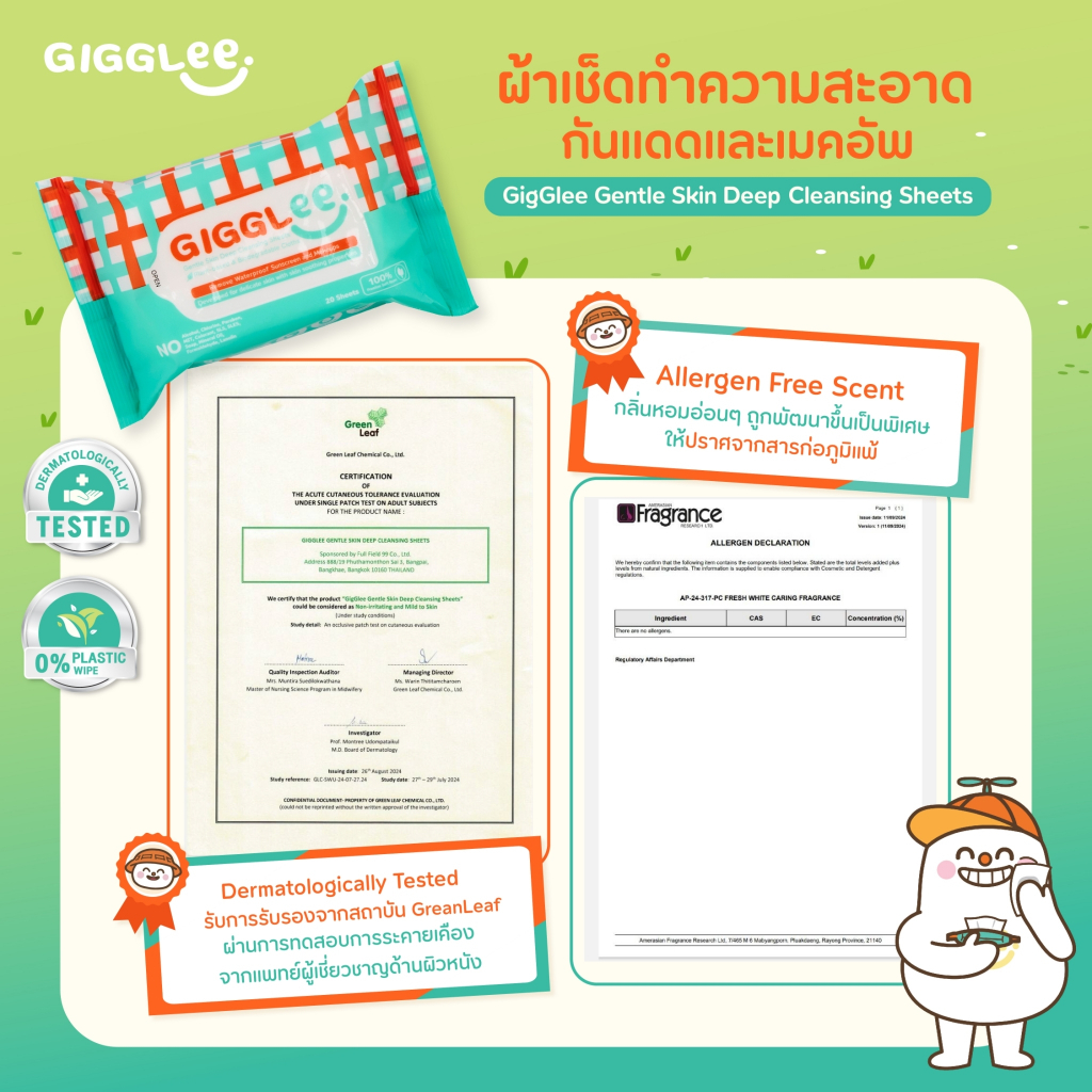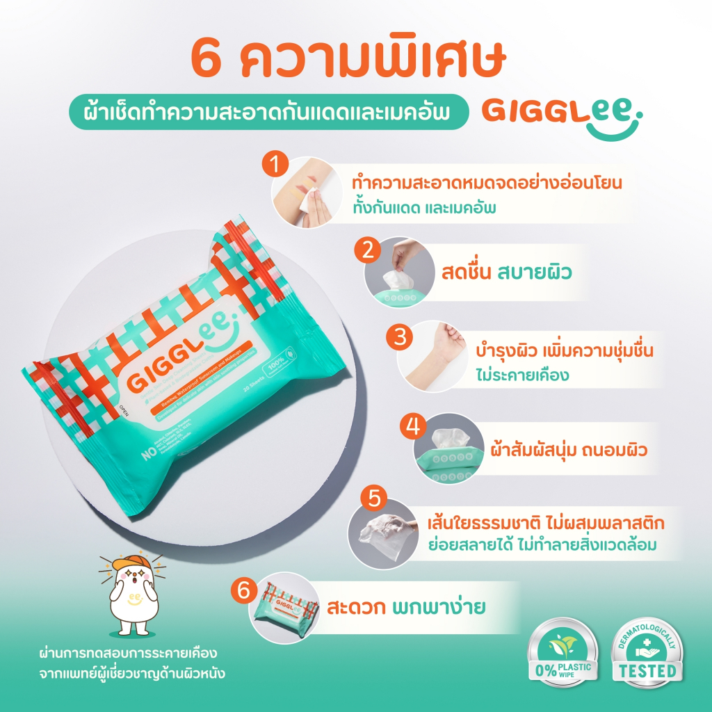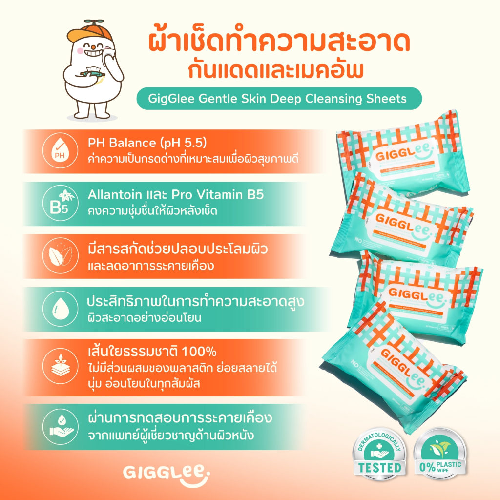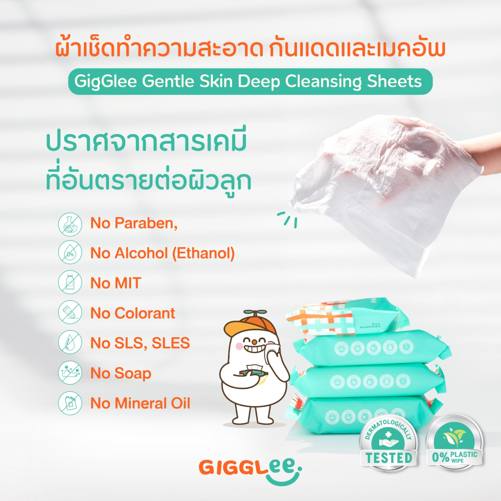 [โปร 4 ชิ้น] ผ้าเช็ดทำความสะอาดครีมกันแดด GigGlee Gentle Skin Deep Cleansing Sheets