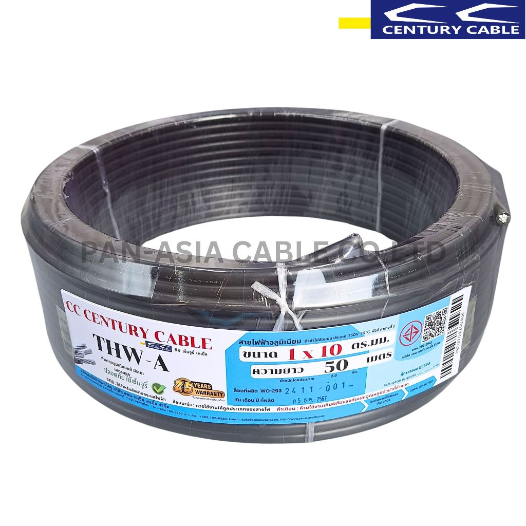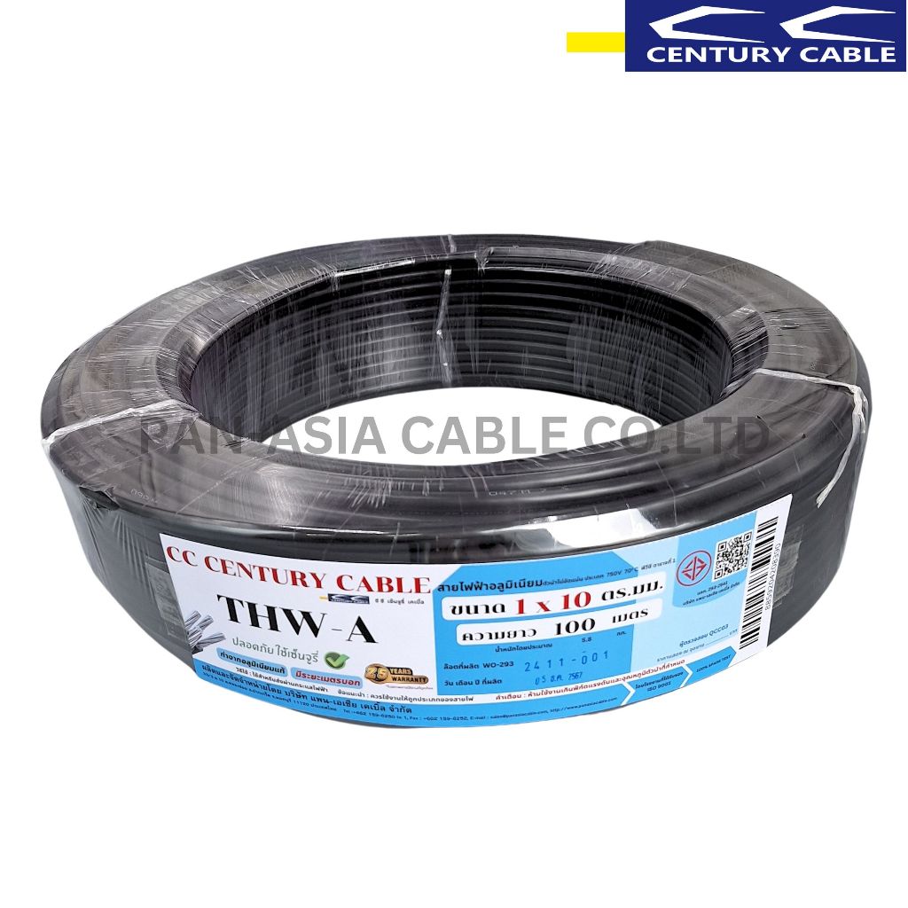 สายไฟ THW-A 1x10 SQ.MM. สายไฟอลูมิเนียมแท้ สายไฟเดี่ยว ทนความร้อน 70 องศา CENTURY(สินค้าส่งตรงจากโรงงานผลิตในไทย)
