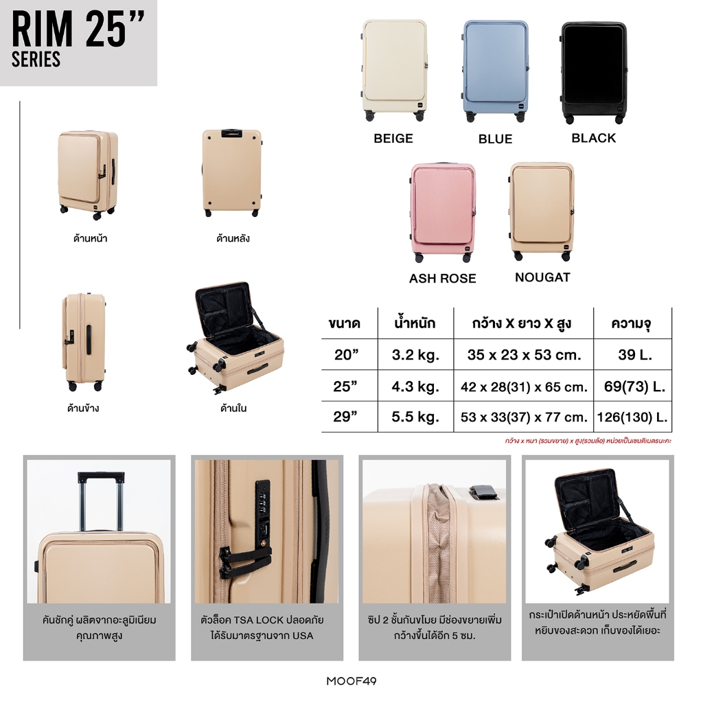 MOOF49 กระเป๋าเดินทางรุ่น RIM Series Luggage ขนาด 25" (รับประกัน 1 ปี) PC100% ล้อ hinomoto เปิดหน้า