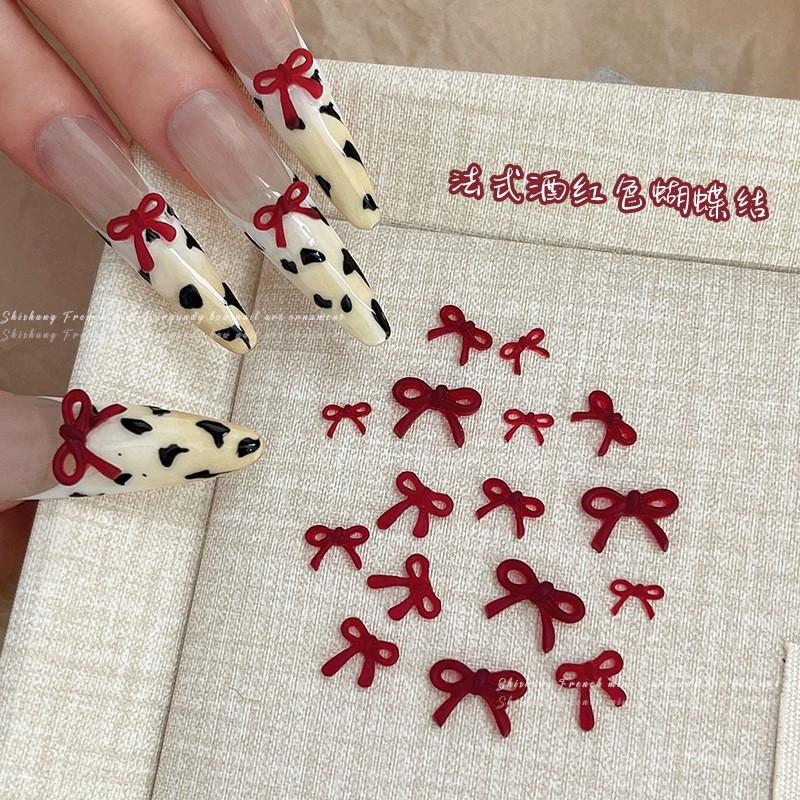 Rou Bao 50 ชิ้นเล็บไวน์ฝรั่งเศสโบว์สีแดง Girly 3D เรซิ่นเล็บ Art DIY Charms ตกแต่ง