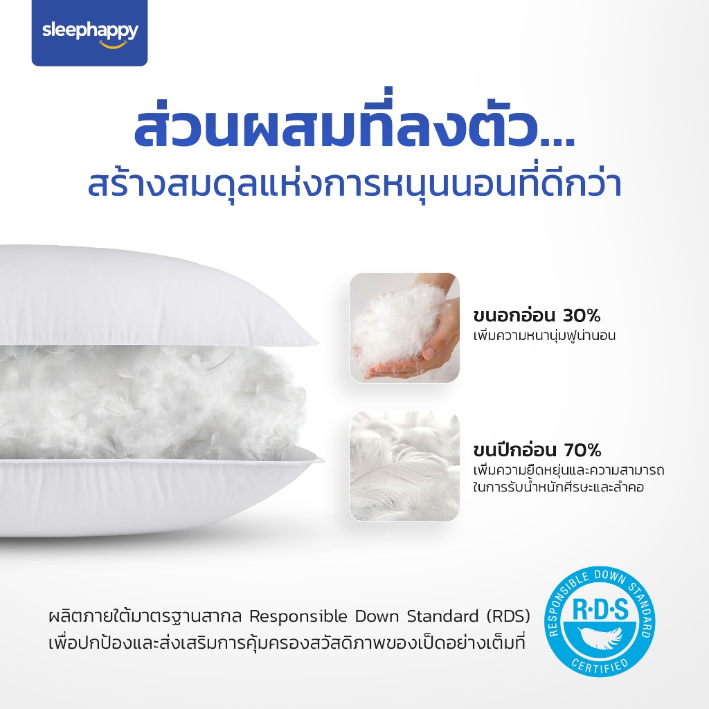 SleepHappy หมอนขนเป็ดแท้ 100% เกรดพรีเมี่ยม นอนสบาย หลับสนิท โอบรับศีรษะและลำคอทุกองศา เหมือนนอนโรงแรม 5 ดาว