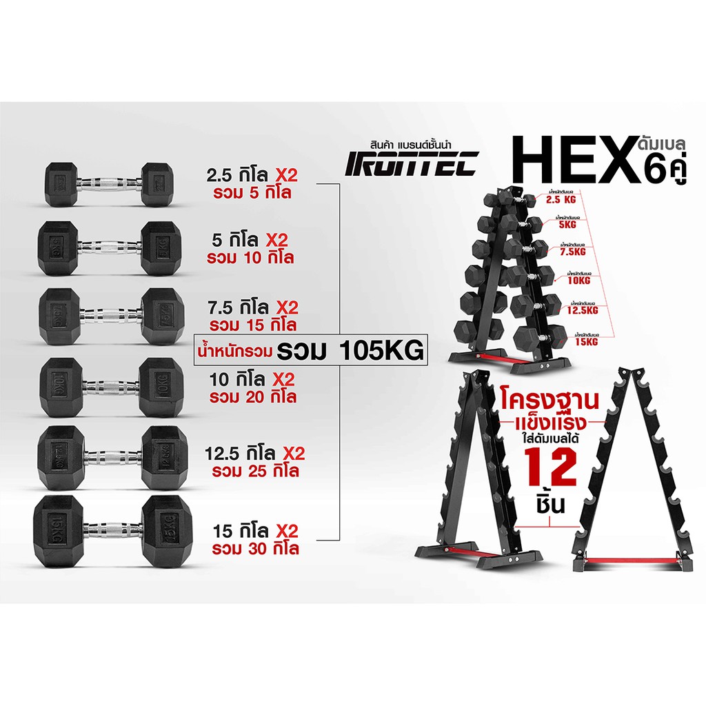 [PRE-ORDER 30 วัน] ดัมเบล HEX 6 คู่ (2.5-15KG) พร้อมขาตั้ง - เครื่องออกกำลังกาย แบรนด์ IRONTEC