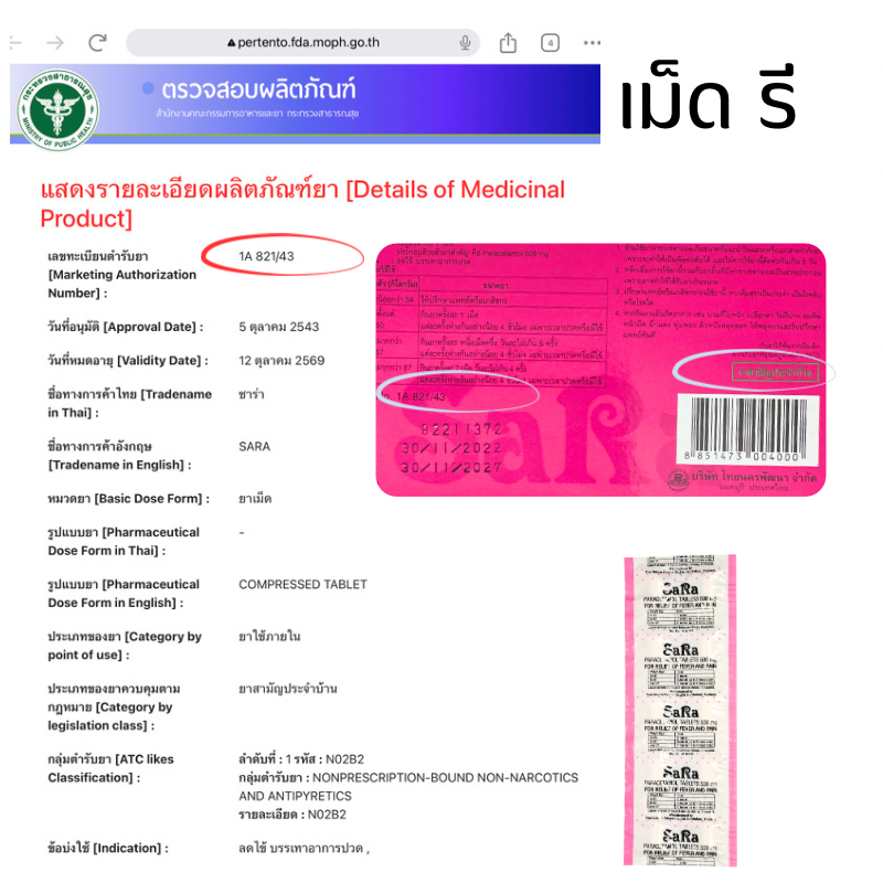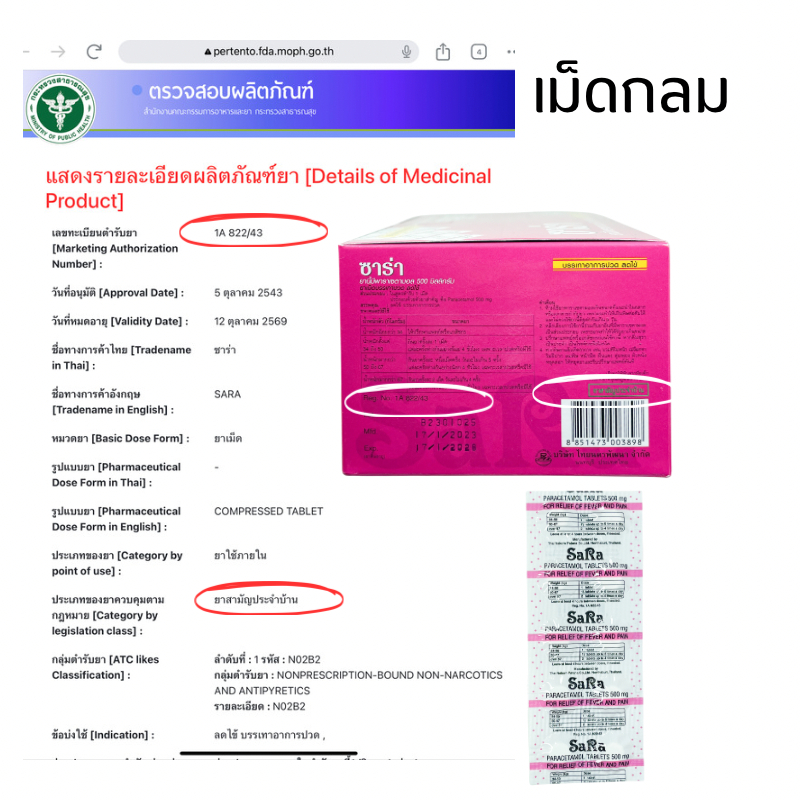 ซาร่า sara paracetamol 500mg พาราเซตามอล ยาสามัญประจำบ้าน (มีหลายขนาด)