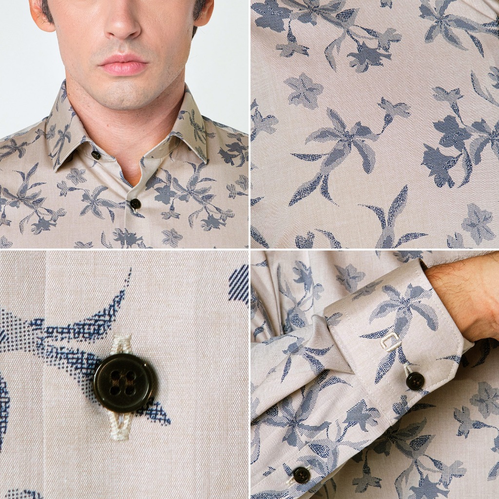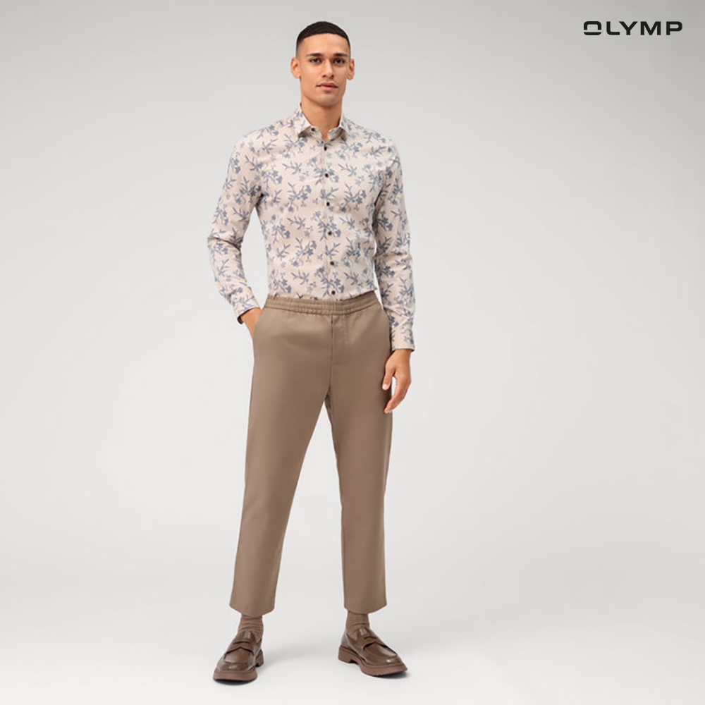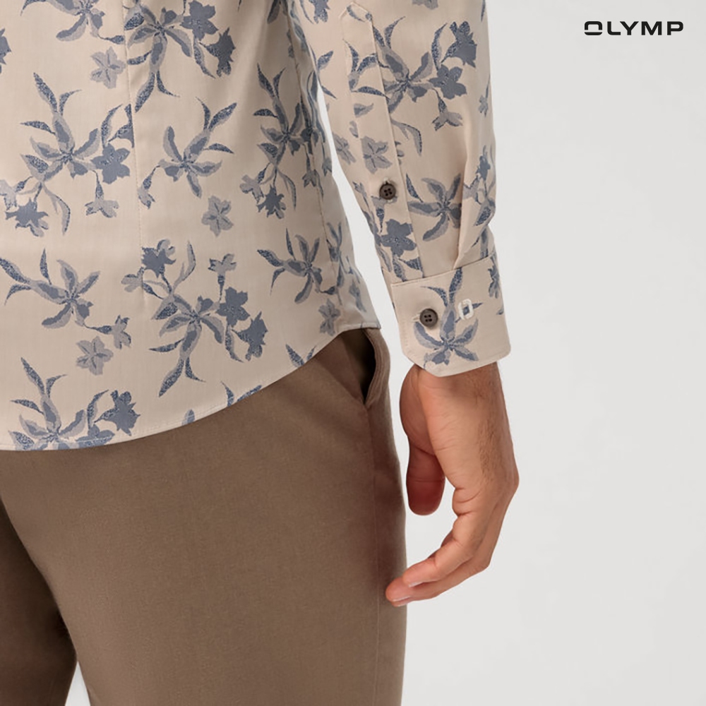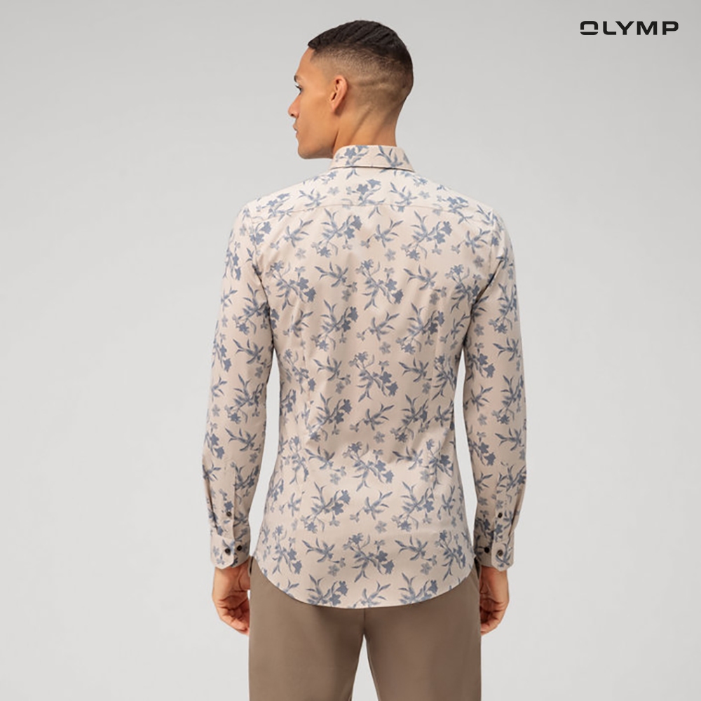 OLYMP No. Six Shirt เสื้อเชิ้ตชาย ผ้าเรียบลายพิมพ์ดอกไม้ สีเบจ ทรงเข้ารูป ยืดหยุ่นได้ดี รีดง่ายSUMMER