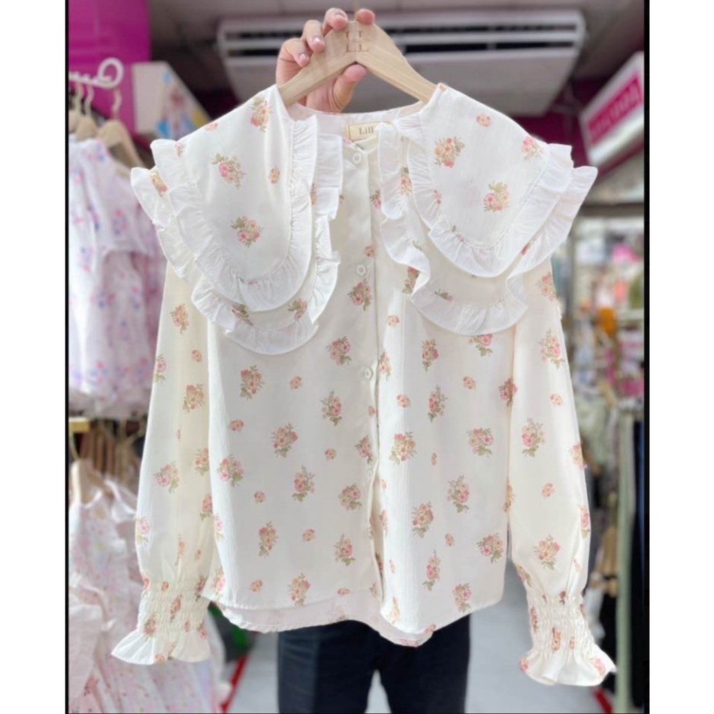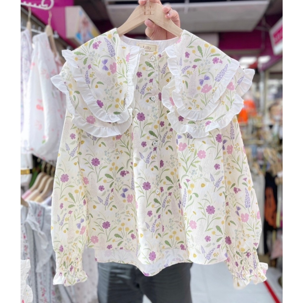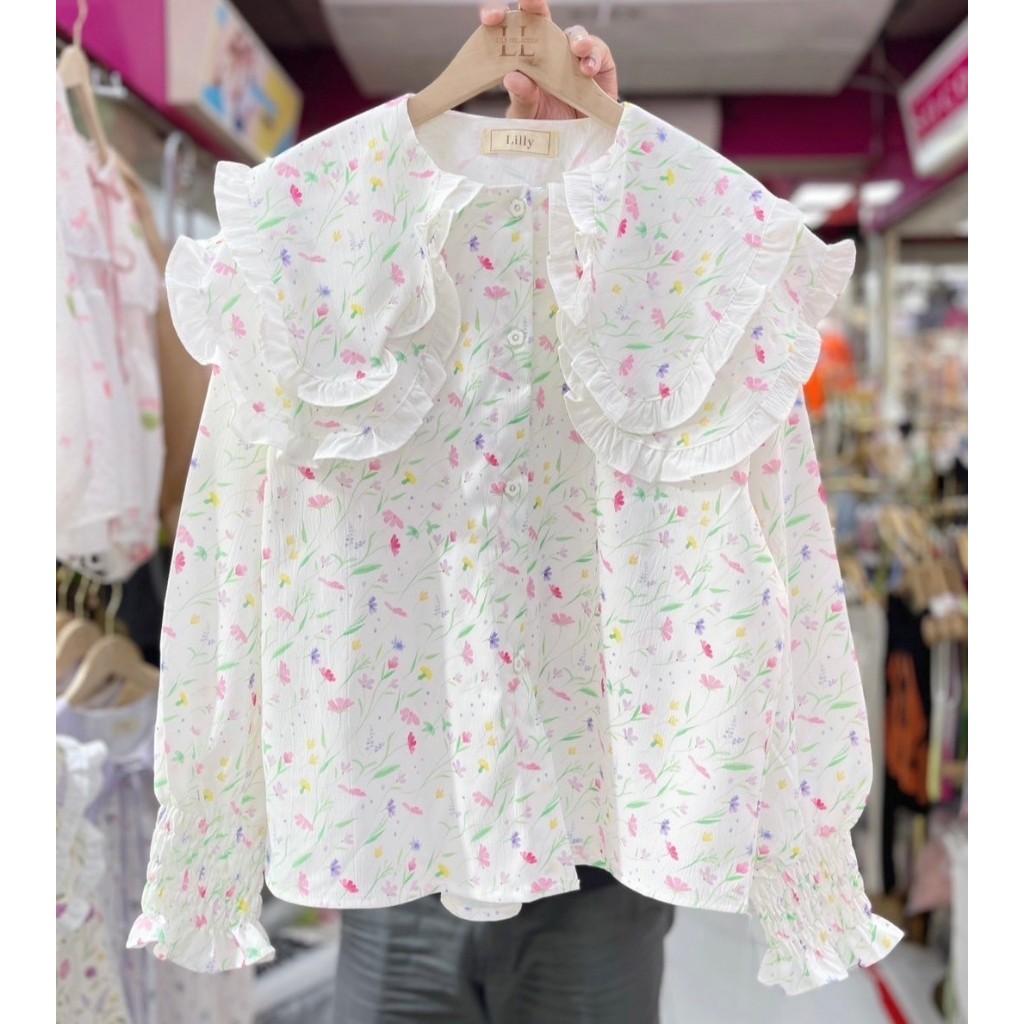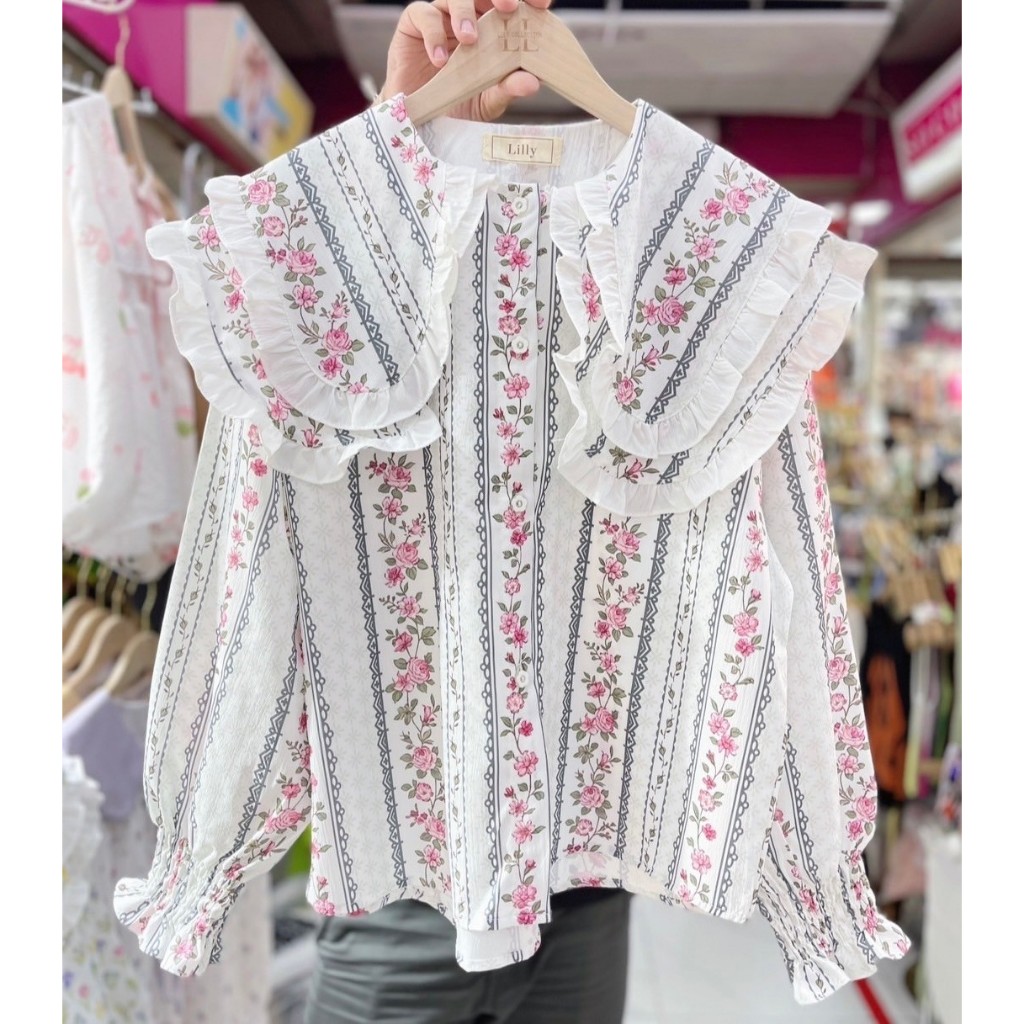 ป้าย Lilly เสื้อผ้าครัชพิมพ์ลายคอบัวปก 2 ชั้นระบายที่ปก อก 42 นิ้ว
