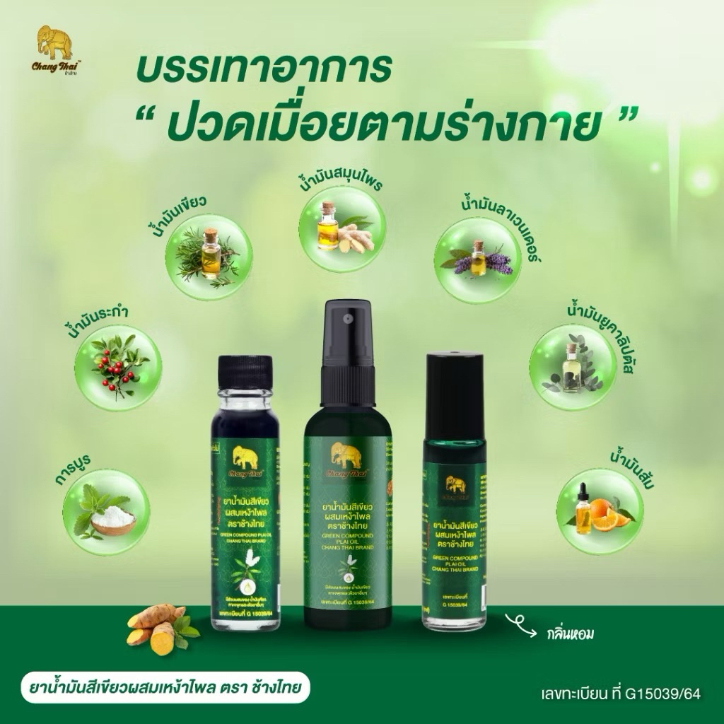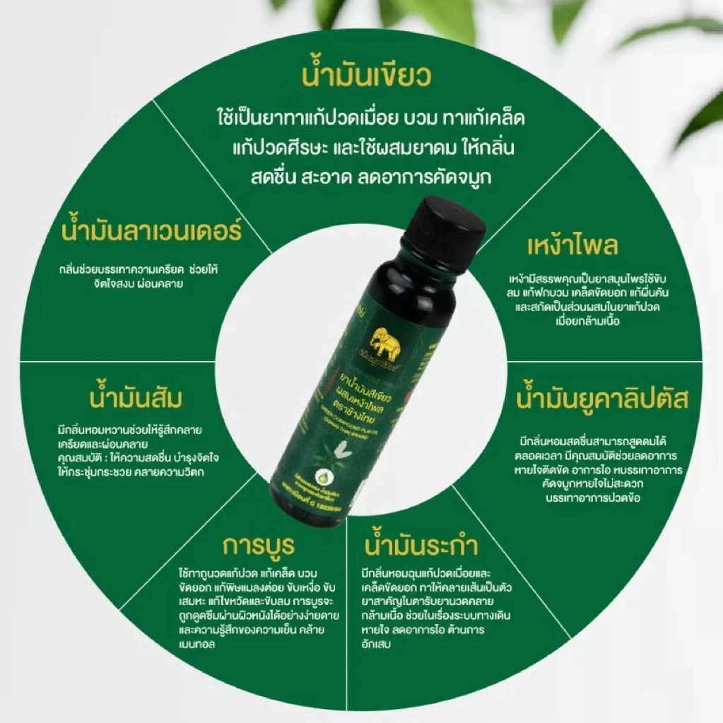 ยาน้ำมันสีเขียวผสมเหง้าไพล ตราช้างไทย บรรเทาอาการปวดเมื่อยตามร่างกาย