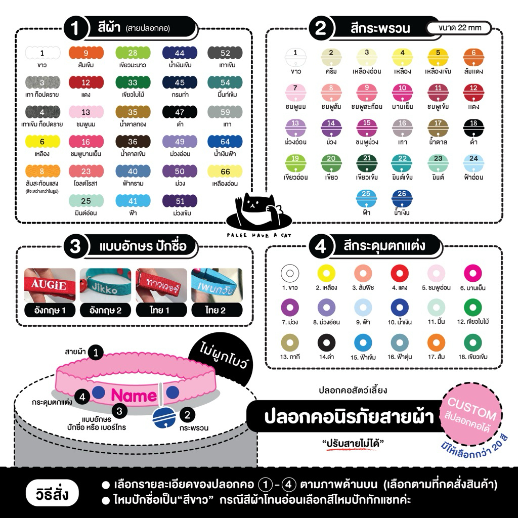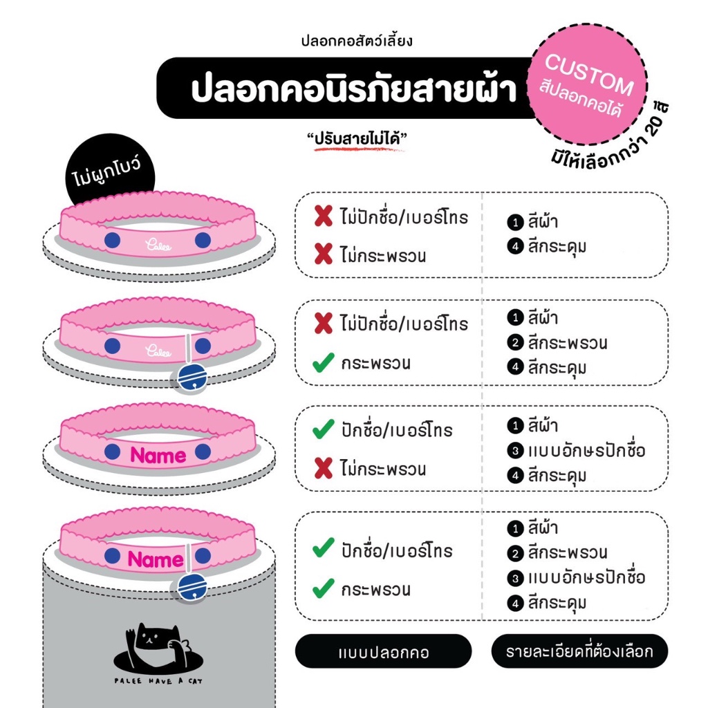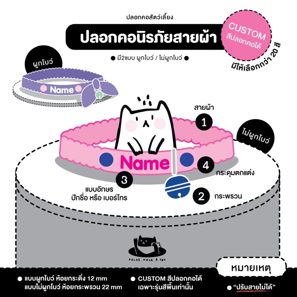PALEE ปลอกคอแมว “รุ่นนิรภัยยางยืด สายผ้า” ออกแบบสีปลอกคอได้! /ปักชื่อ เบอร์โทร/แมว สุนัข (ปลอกคอแบบสวม ปรับสายไม่ได้)