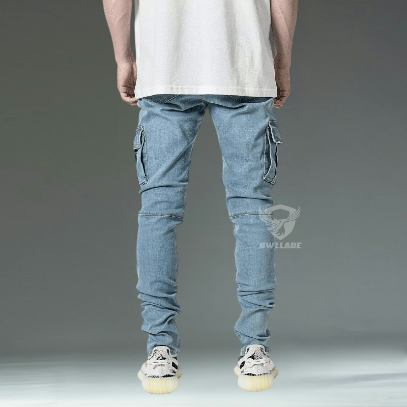 Eaglade Skinny Slim Fit Denim Cargo Jeans Pants for Men L0066 สีดํา