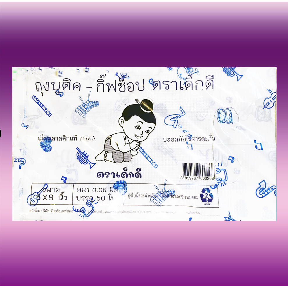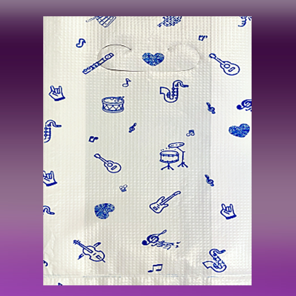ถุงบูติคขนาด5+1x9หนา.06มิลเนื้อถุงขาวพิมพ์ลายจำนวน1มัด/10ห่อ/50ใบ