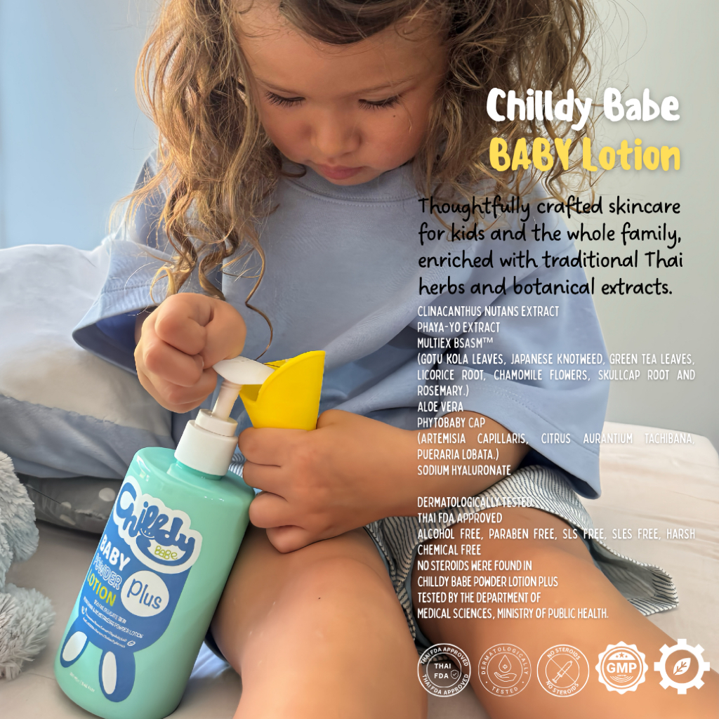 Chilldy Babe Baby Powder Lotion Plus ชิลล์ดี้เบ๊บ แป้งเด็กเนื้อโลชั่น พญายอ เสลดพังพอน