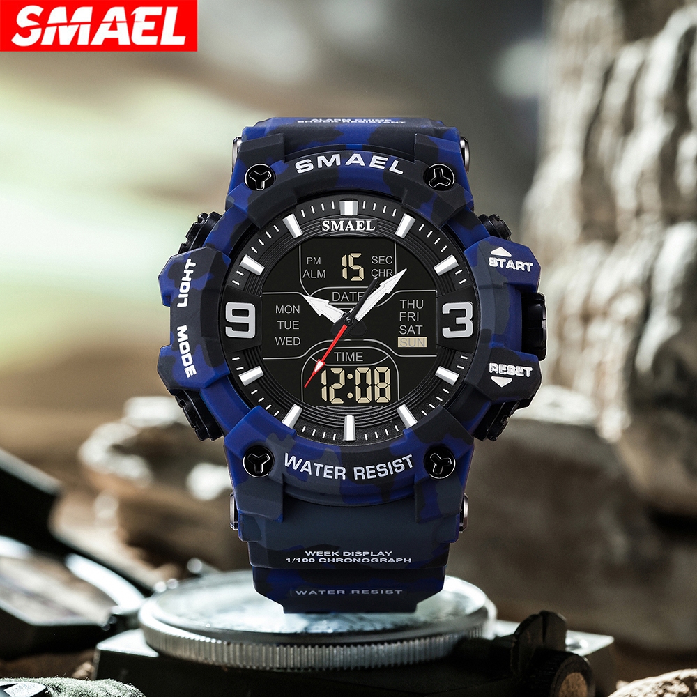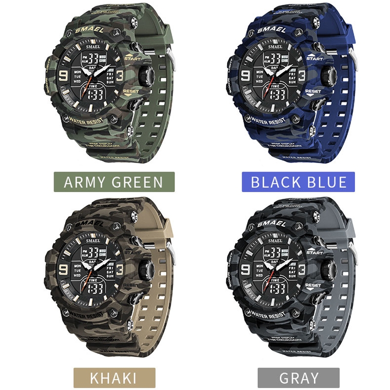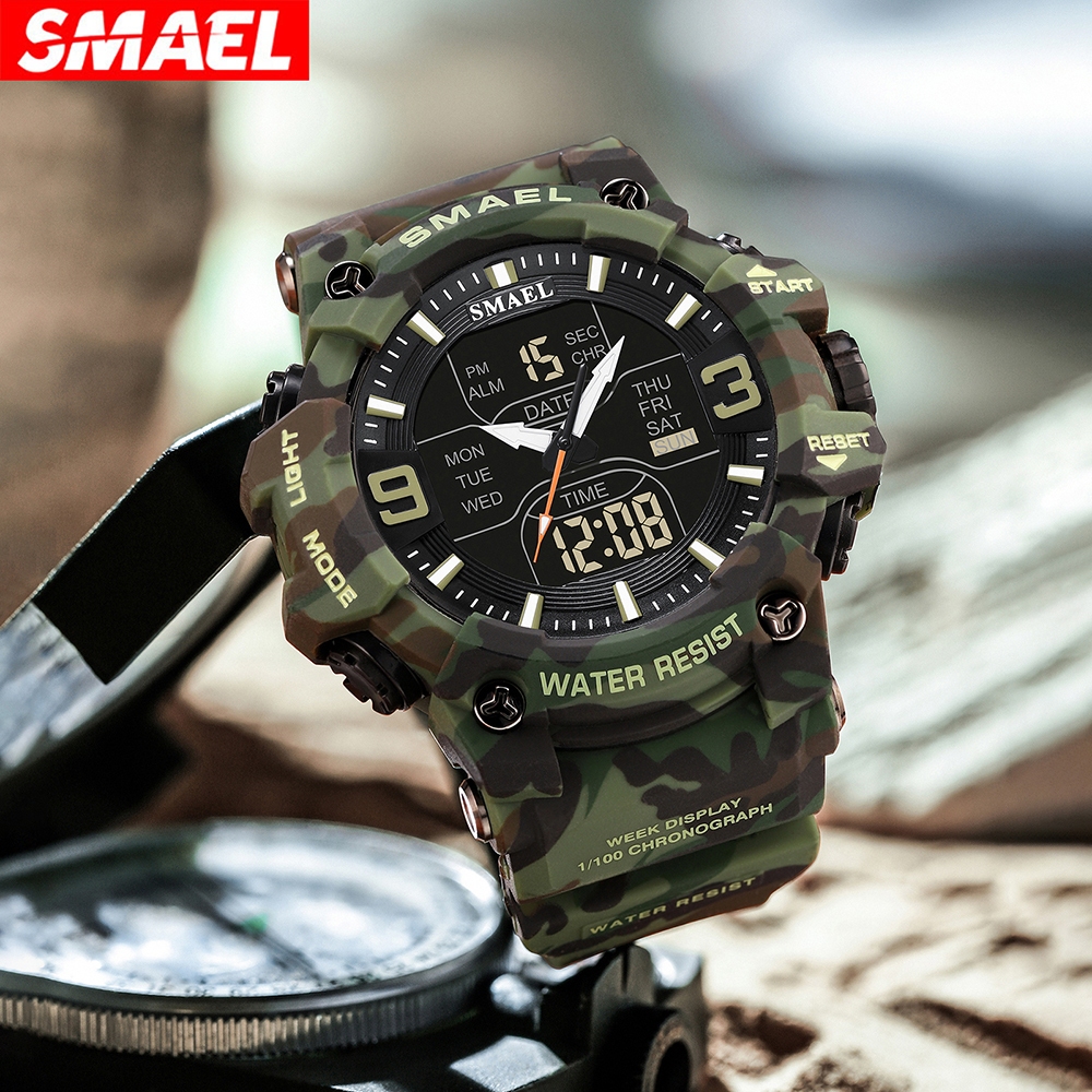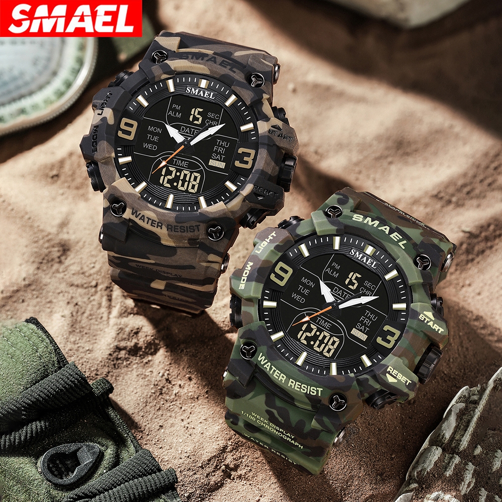 Smael นาฬิกาข้อมือดิจิทัลอิเล็กทรอนิกส์ กันน้ํา ลายพราง สไตล์สปอร์ต แฟชั่นสําหรับผู้ชาย