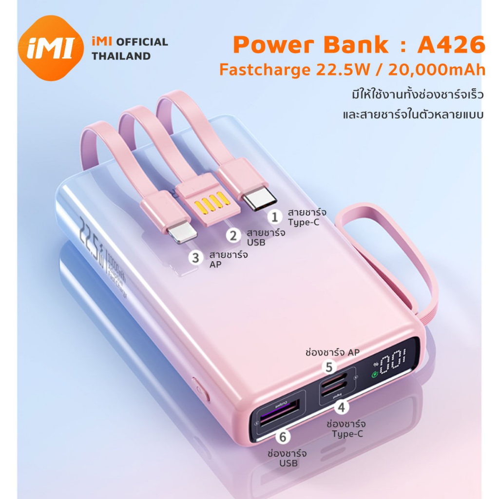 iMI Powerbank 20000mAh ชาร์จเร็ว 22.5W มีสายในตัว พาวเวอร์แบงค์ ขึ้นเครื่องบินได้ รับประกัน1ปี