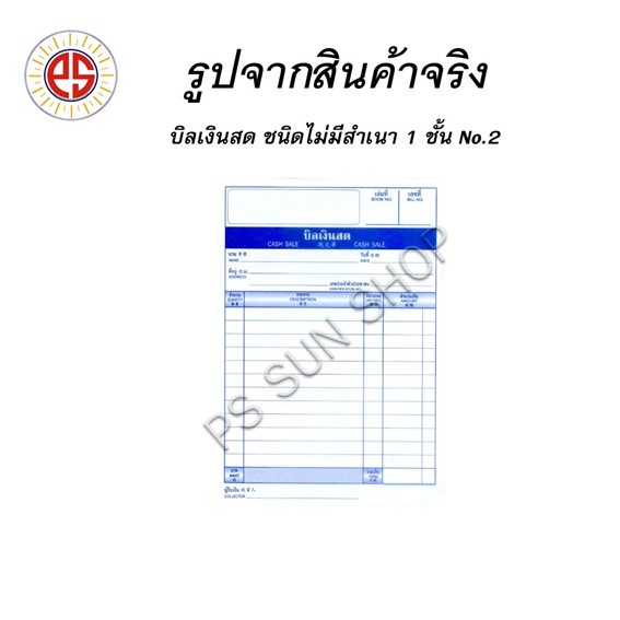 บิลเงินสด PS SUN ชนิดไม่มีสำเนา No.2 1 ชั้น (ราคาต่อ 1 เล่ม)