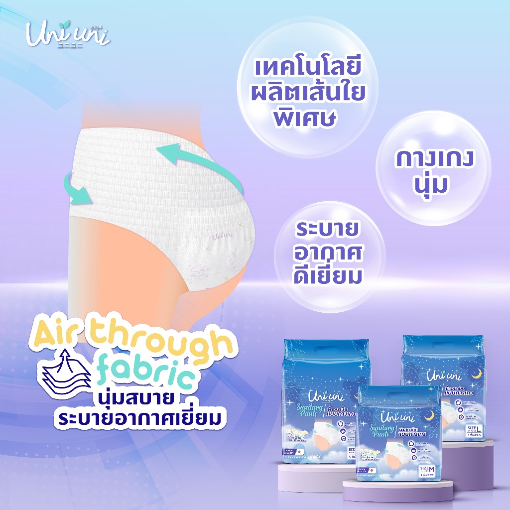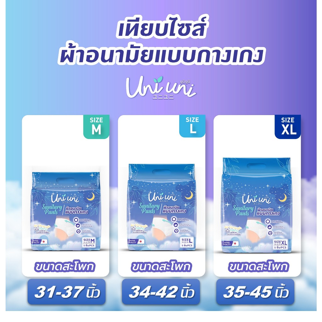 (3 แพค 15 ชิ้น) Uni Uni ผ้าอนามัยแบบกางเกง ขอบเอวนุ่ม แห้งสบาย เรียบเนียน ซึมซับดีเยี่ยม ไซส์ M L XL