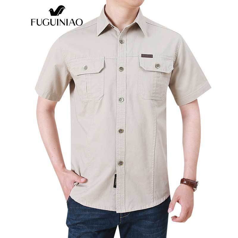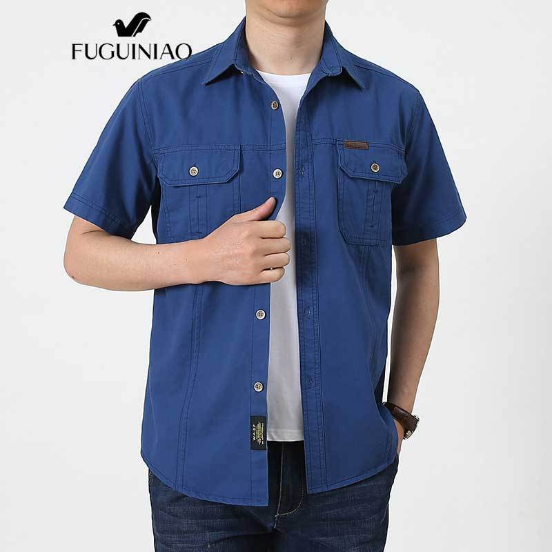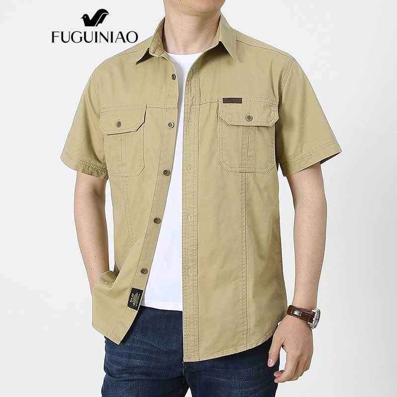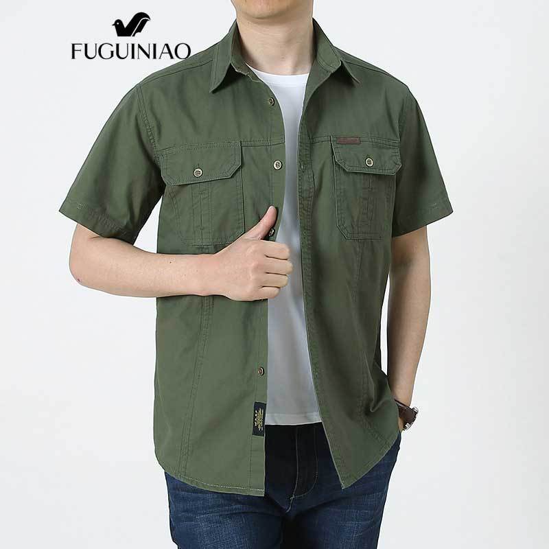 Fuguiniao เสื้อเชิ้ตแขนสั้นลําลอง สีพื้น พร้อมกระเป๋า แฟชั่นฤดูร้อน สไตล์ทหาร สําหรับผู้ชาย