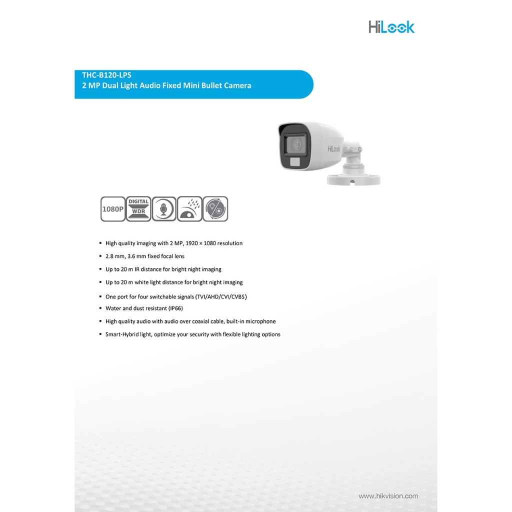HILOOK กล้องวงจรปิด HDTVI CCTV รุ่น THC-B120-LPS 2MP Outdoor ภาพสี 24ชม. รองรับ 4ระบบ มีไมค์ในตัว