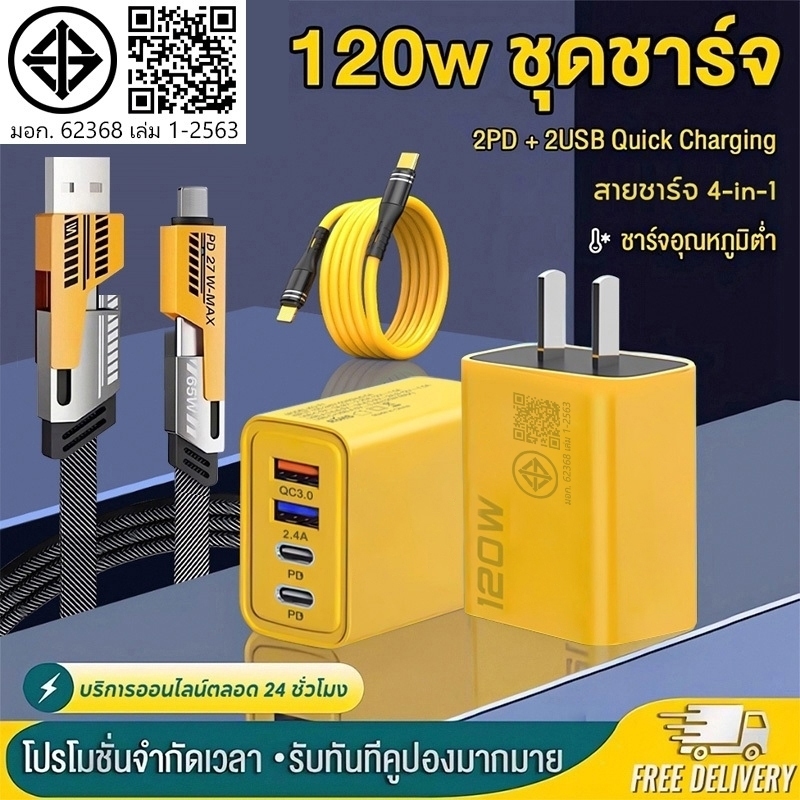 [ รับประกัน 1 ปี ] 120W PD หัวชาร์จ+สายชาร์จ QC 3.0 Quick charging 2PD + 2USB Adapter สําหรับ i15 14 13 12 Micro USB TYPE-C