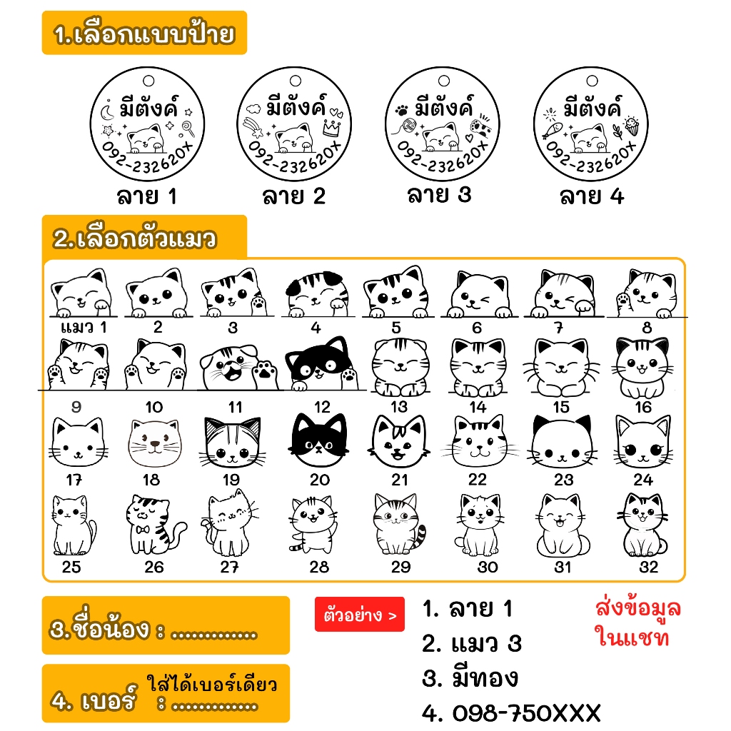 ป้ายชื่อแมว 4 ลายใหม่ ขนาด 1.- สแตนเลสน้ำหนักเบา ป้ายชื่อสัตว์เลี้ยง