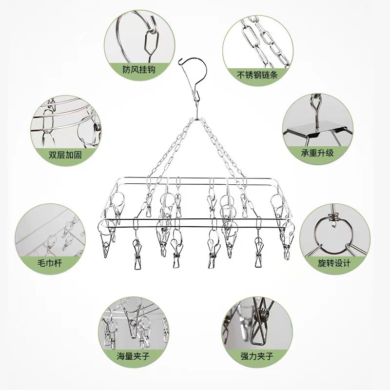 ไม้แขวนเสื้อสแตนเลสแบบหนีบ ราวตากผ้า ถุงเท้าแห้งสิ่งประดิษฐ์ ชั้นวางถุงเท้ากันลมอเนกประสงค์