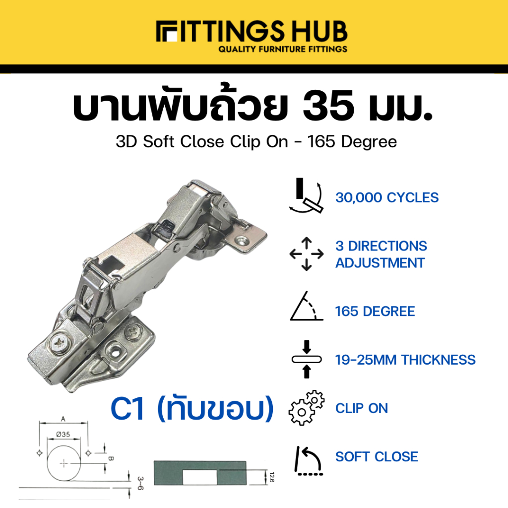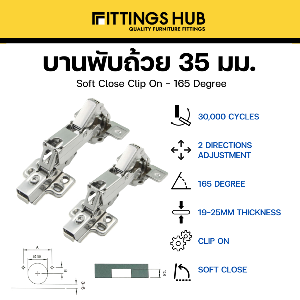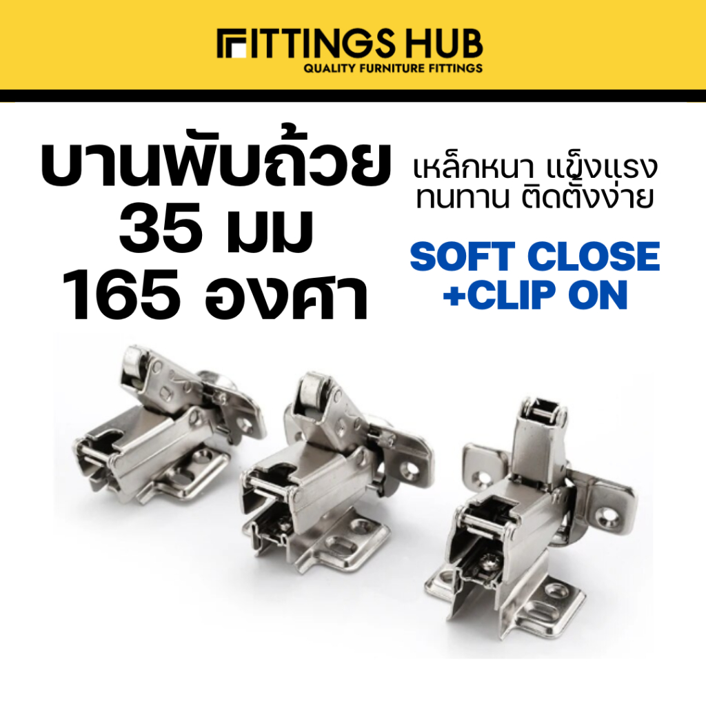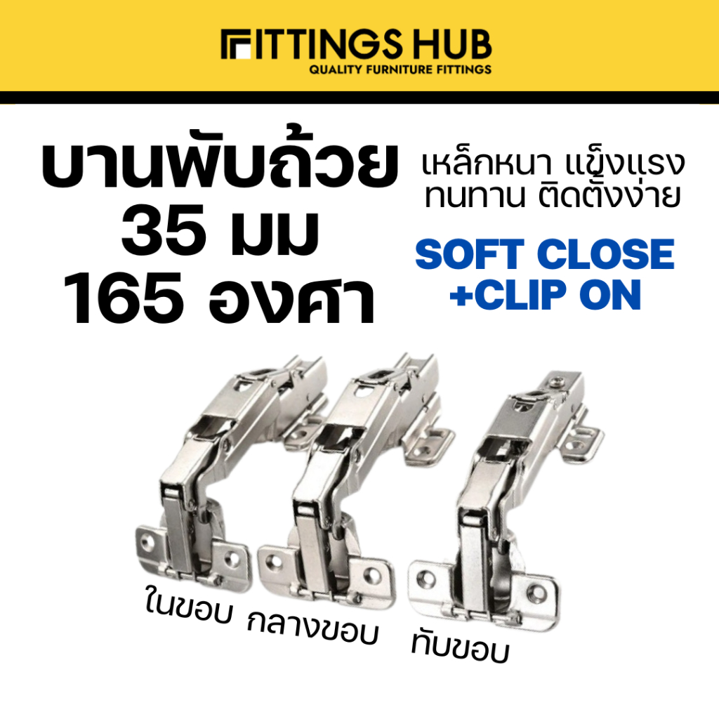 (1 ตัว)บานพับถ้วย 165 องศา soft close + clip on ทับขอบ กลางขอบ ในขอบ - Fittingshub