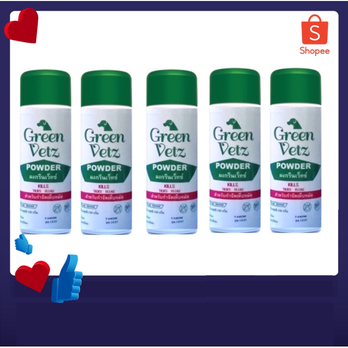 Green Vetz (5 กระป๋อง) ผงโรยตัวสุนัข แป้งกำจัดเห็บ หมัด สุนัข (150 g) /(Prakijtho)