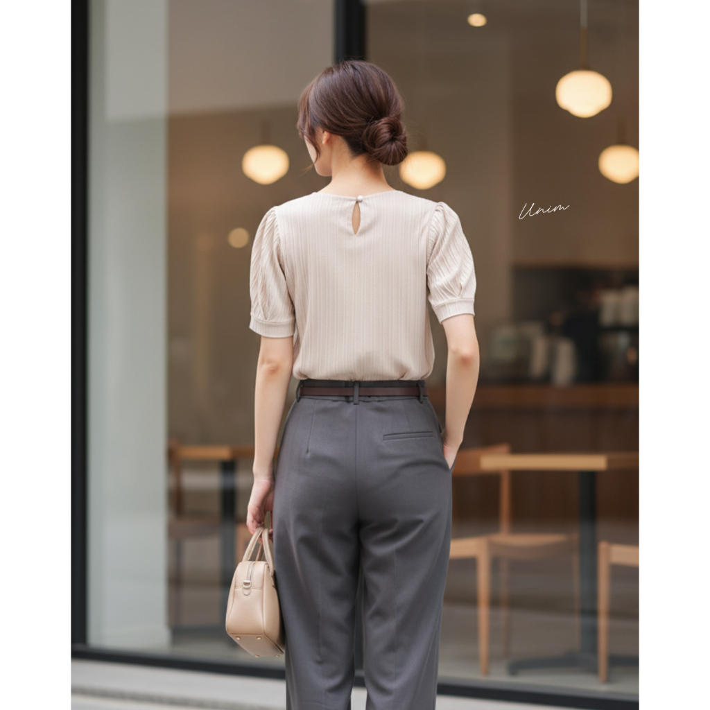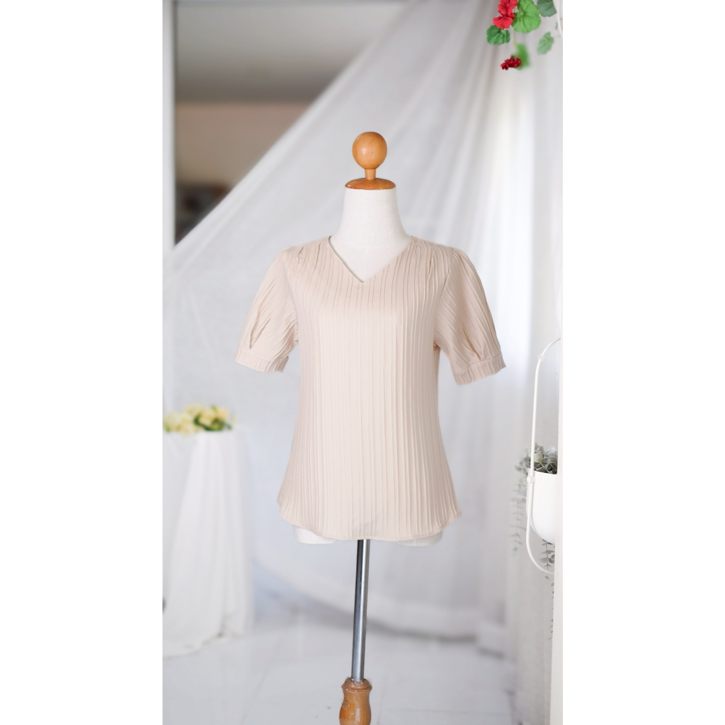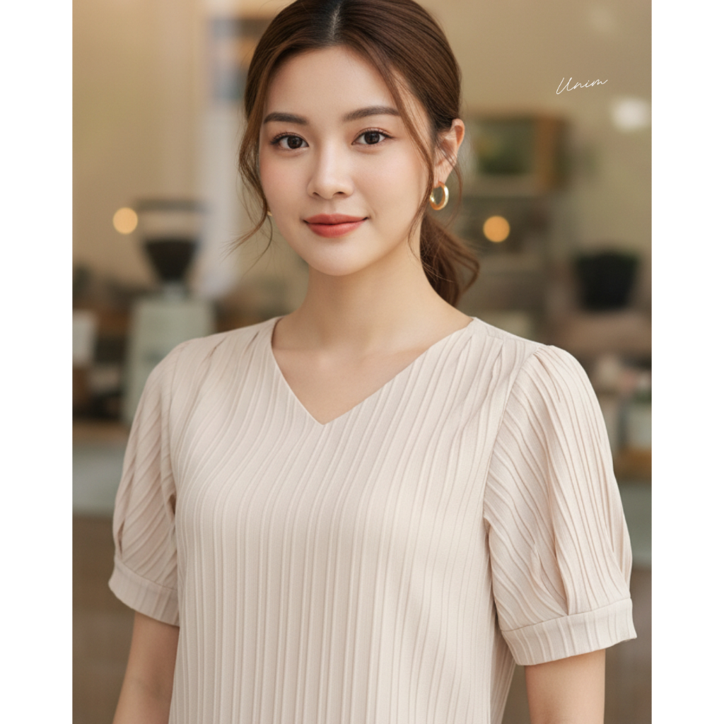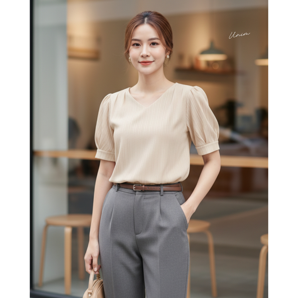 Unim เสื้อคอวีแขนเจ้าหญิง ครีม(ผ้าdobby)