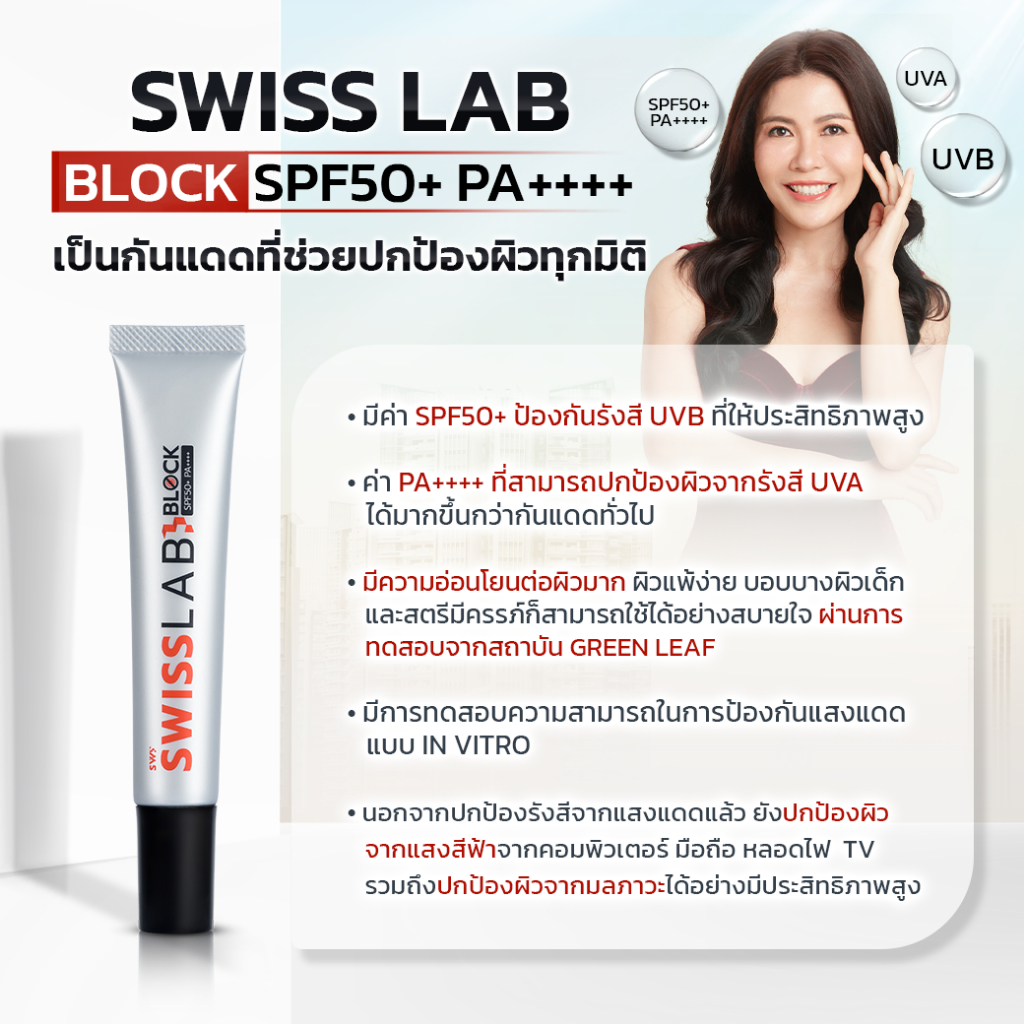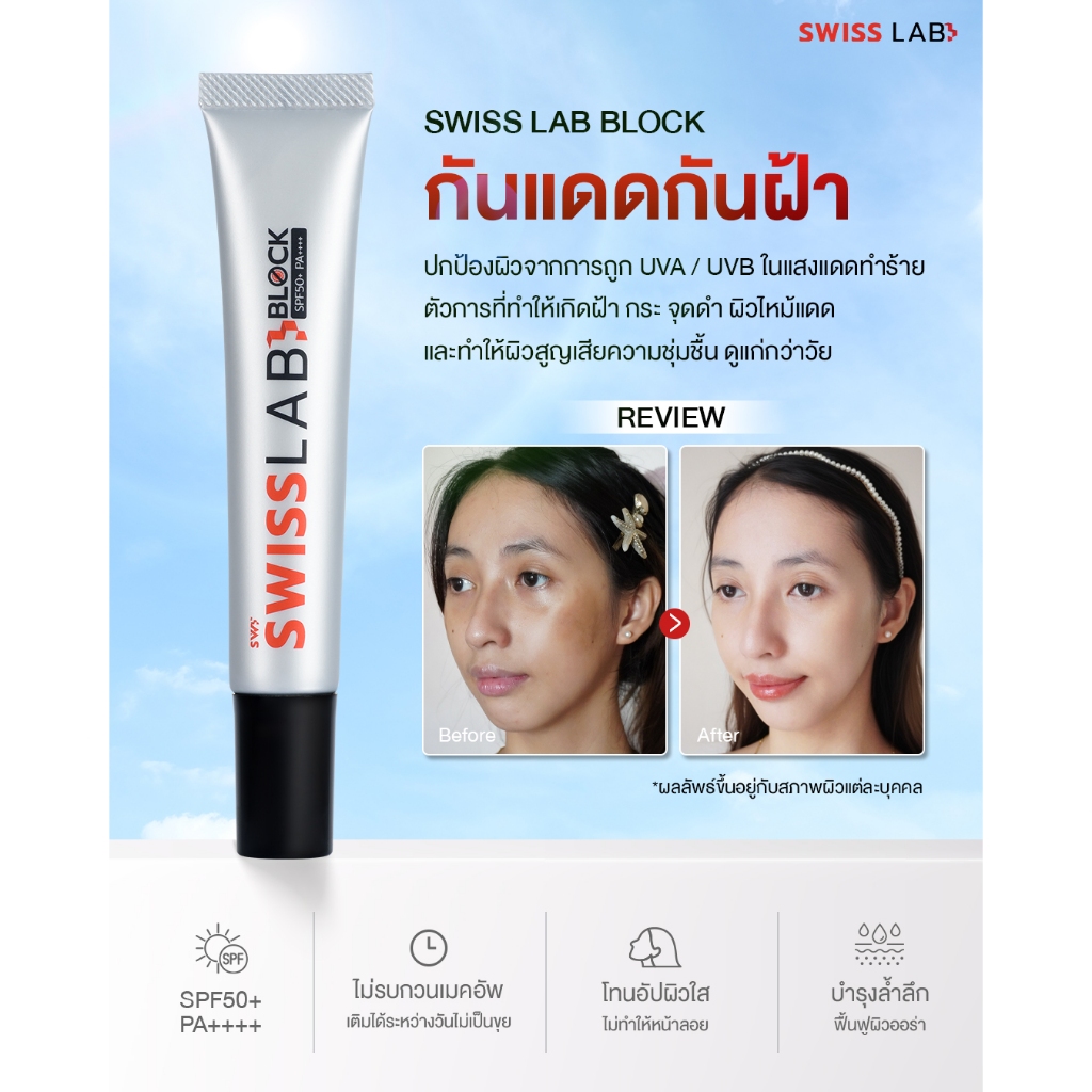(3 หลอด) ครีมกันแดดสวิสแล็บบล็อก อ่อนโยน ซึมไว ปกป้องและบำรุงผิวในตัว SWISSLAB Block SPF50+ PA++++