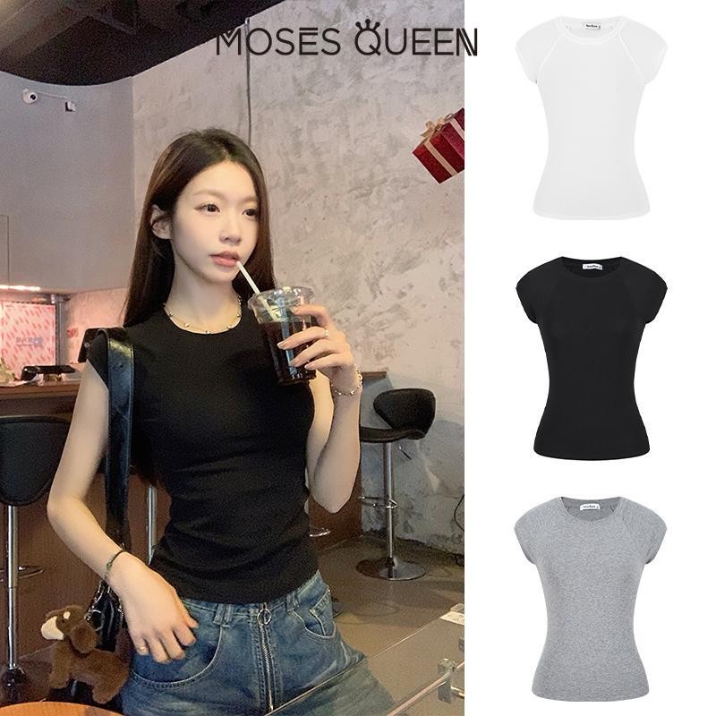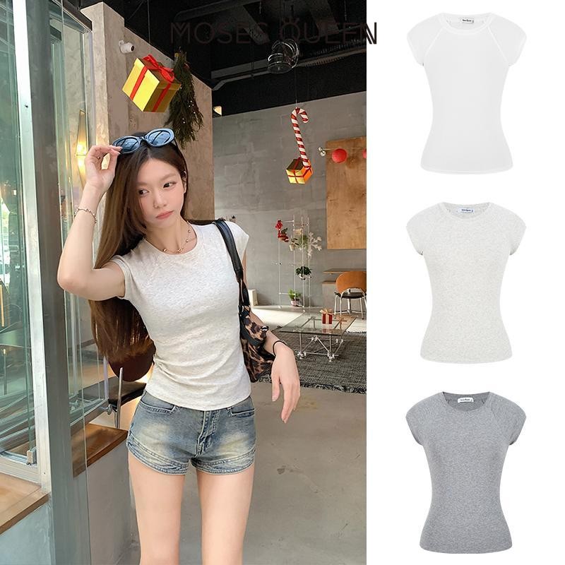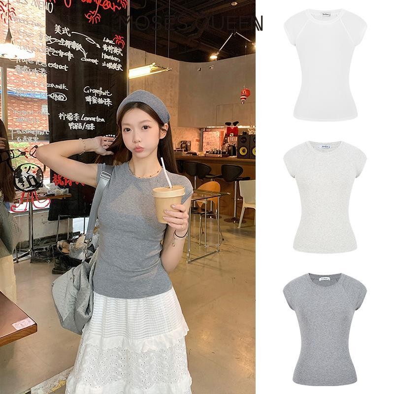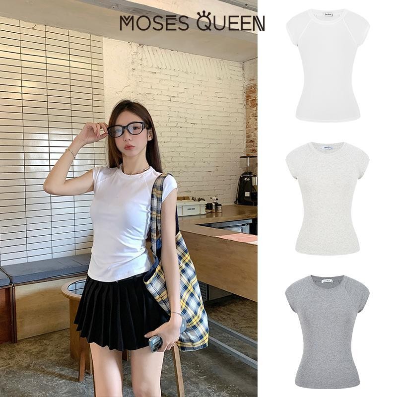 <Moss Queen> American Retro สีทึบรอบคอไหล่ตรงแขนสั้นเสื้อยืดหญิง 2025 ฤดูร้อนใหม่ Slim Fit Top #62847