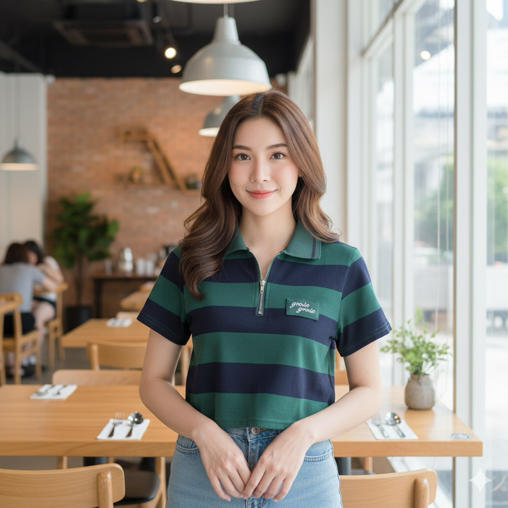 เสื้อครอปลายริ้วงานปัก แต่งซิปรูดขึ้นลง ผ้านิ่มใส่สบาย🌟