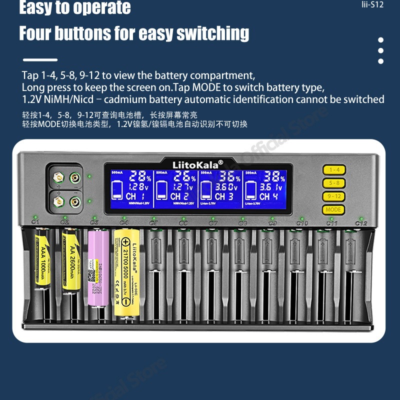 เครื่องชาร์จถ่าน LiitoKala Lii-S12 ชาร์จได้ 12 ก้อน รองรับ 26650,21700,20700, 18650, 18490, 18350 AA AAA - Battery Charg