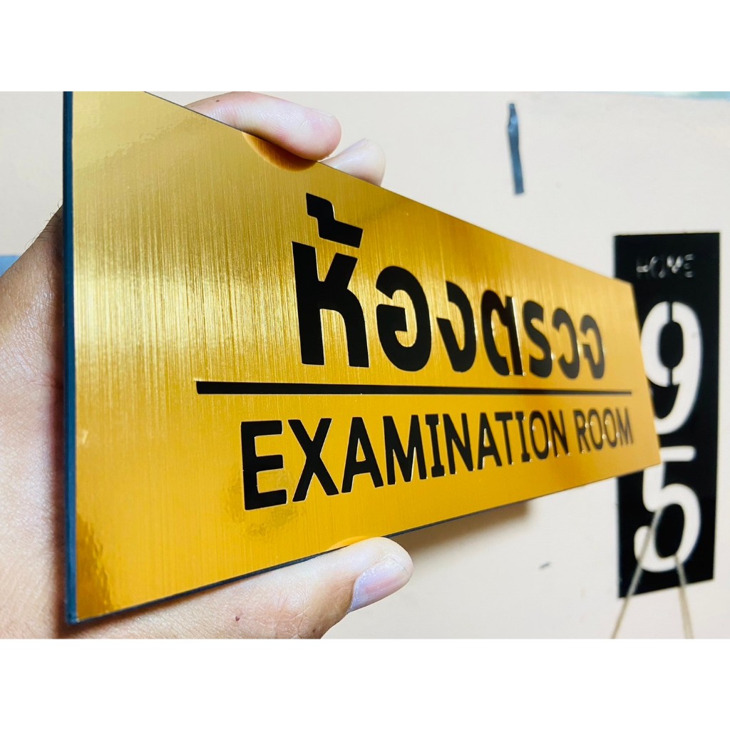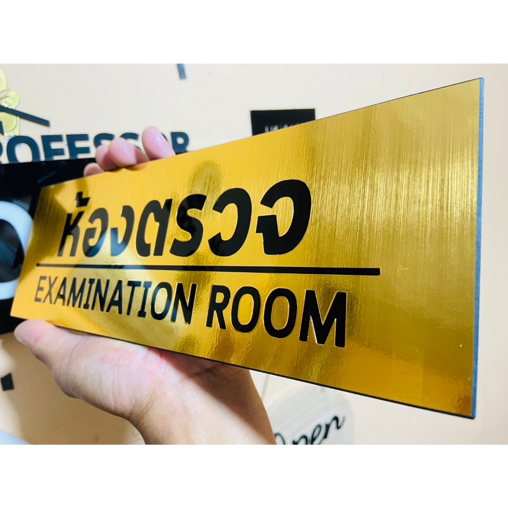 ป้ายอะคริลิค ข้อความ "ห้องตรวจ EXAMINATION ROOM" สีทองแฮร์ไลน์ ขนาด 30x10cm หนา 3 มิล