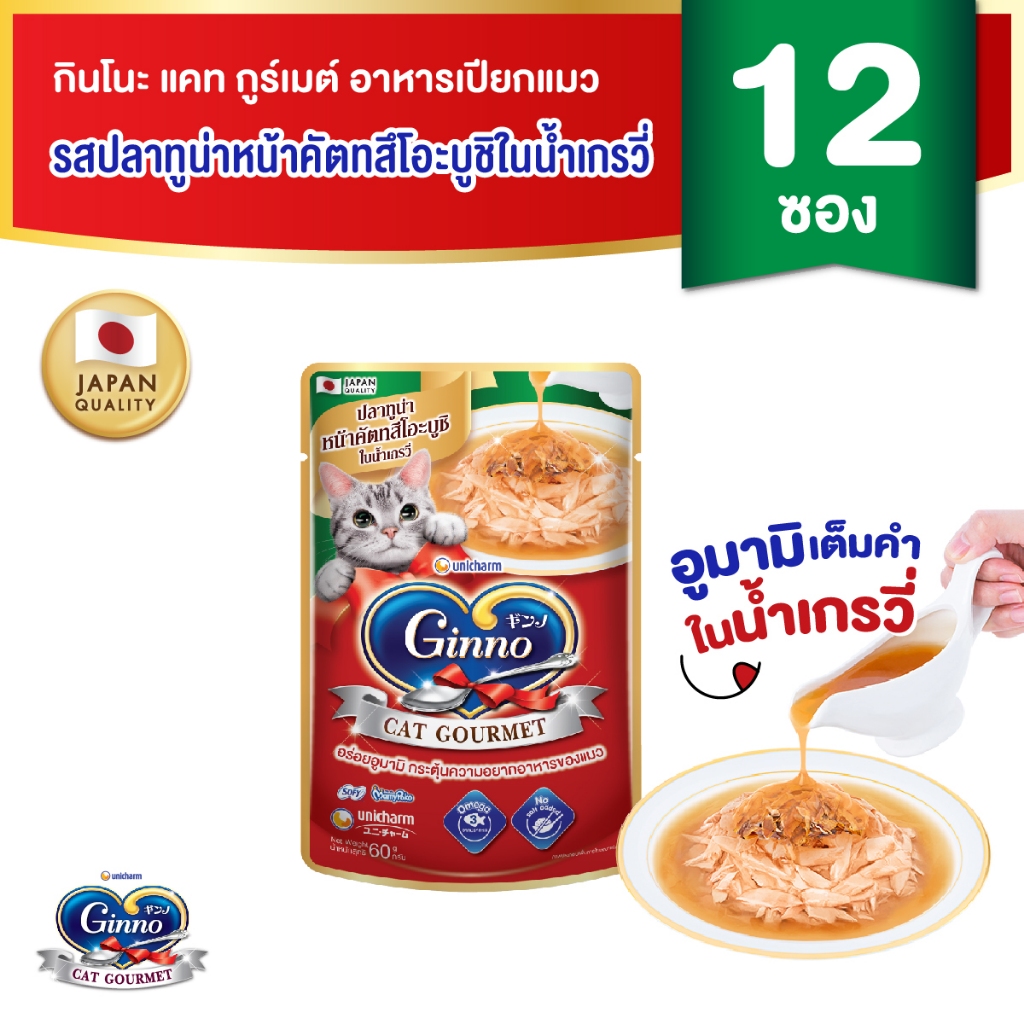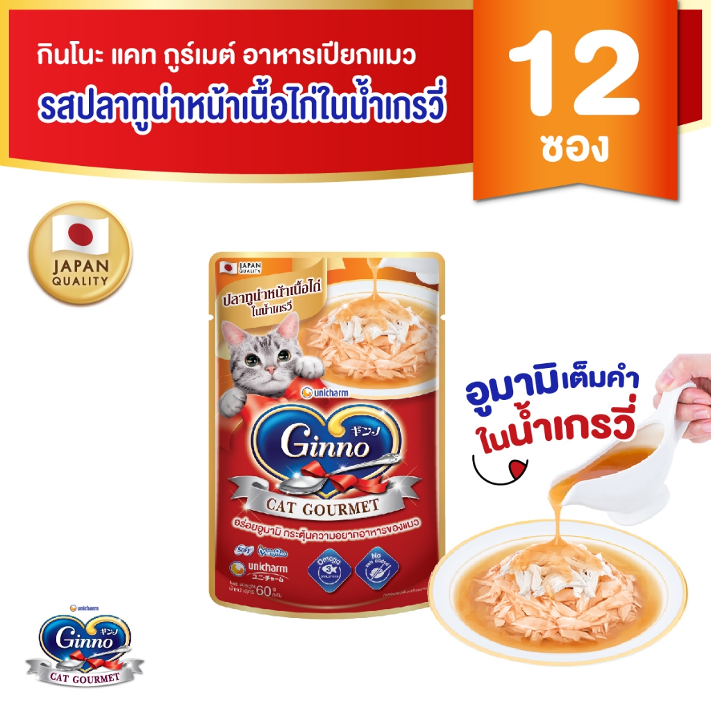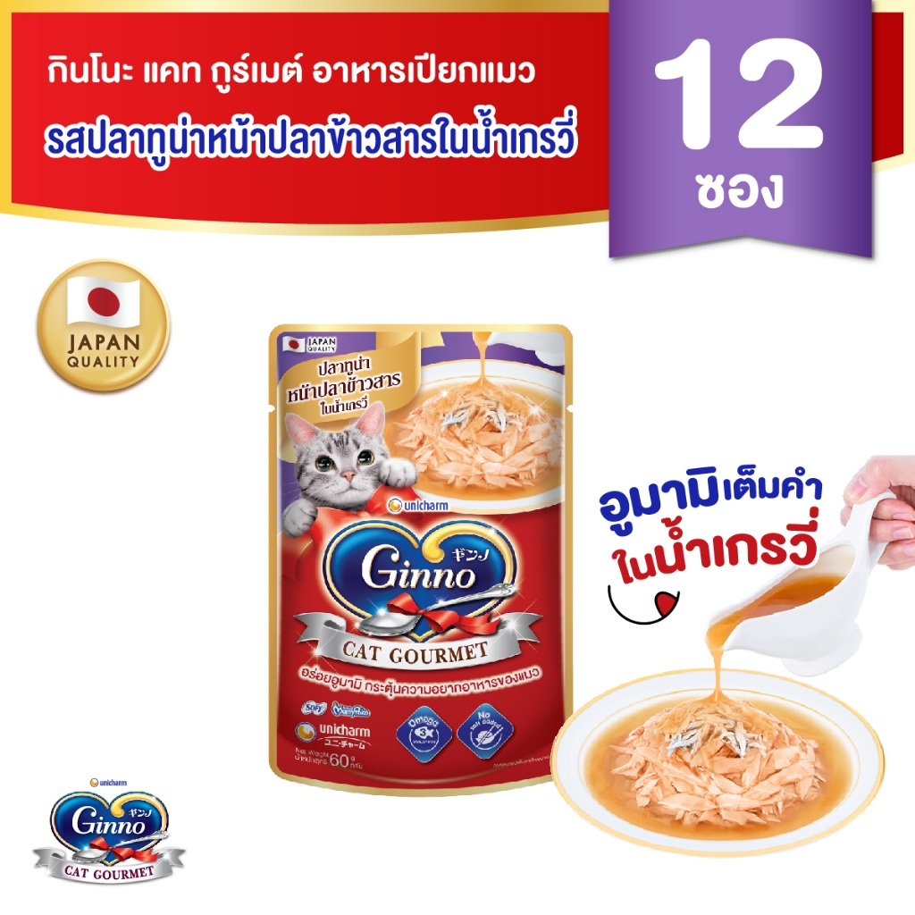 Ginno Gravy กินโนะ แคท กูร์เมต์ อาหารเปียกแมว ในน้ำเกรวี่ 60 กรัม มี 6 รสชาติ x 12 แพ็ค